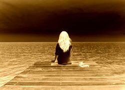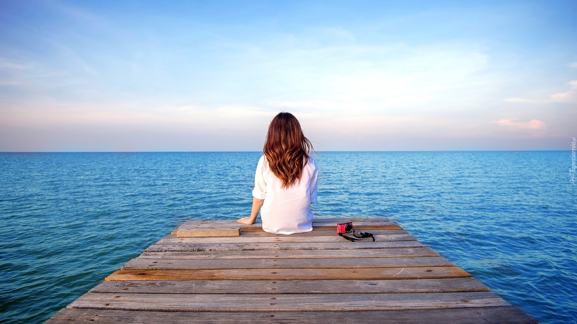 Edytor tapety: Kobieta siedząca na pomoście nad morzem