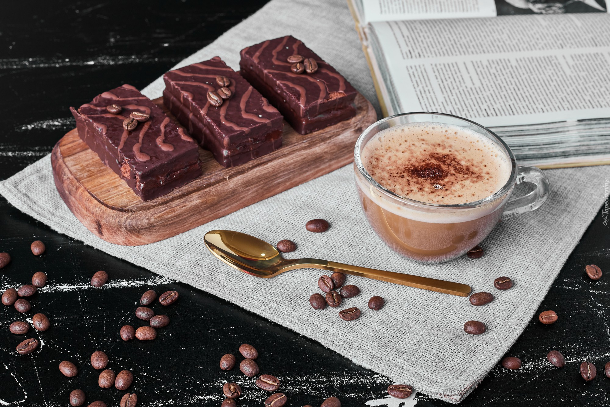 Edytor tapety: Kawa w filiżance obok ciastek i książki