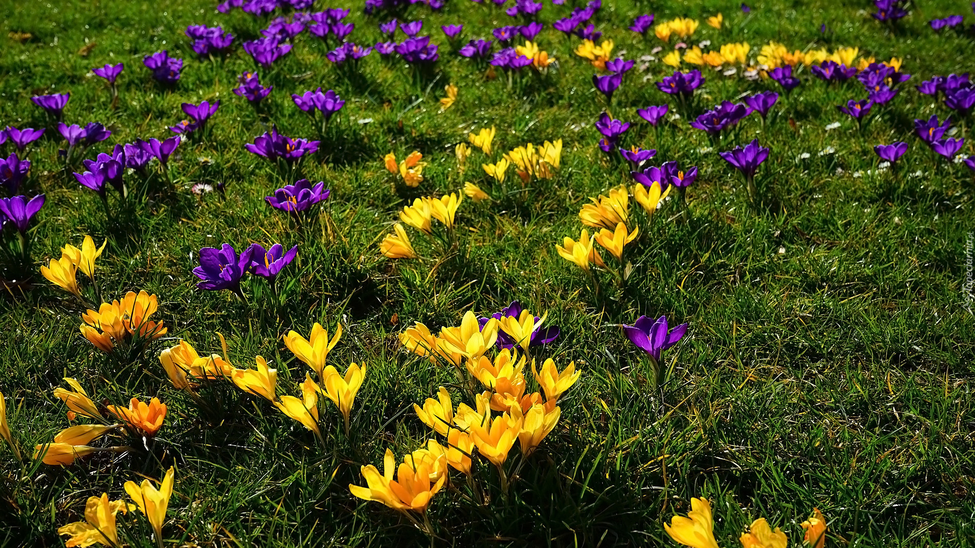 Edytor tapety: Żółte i fioletowe krokusy na trawie