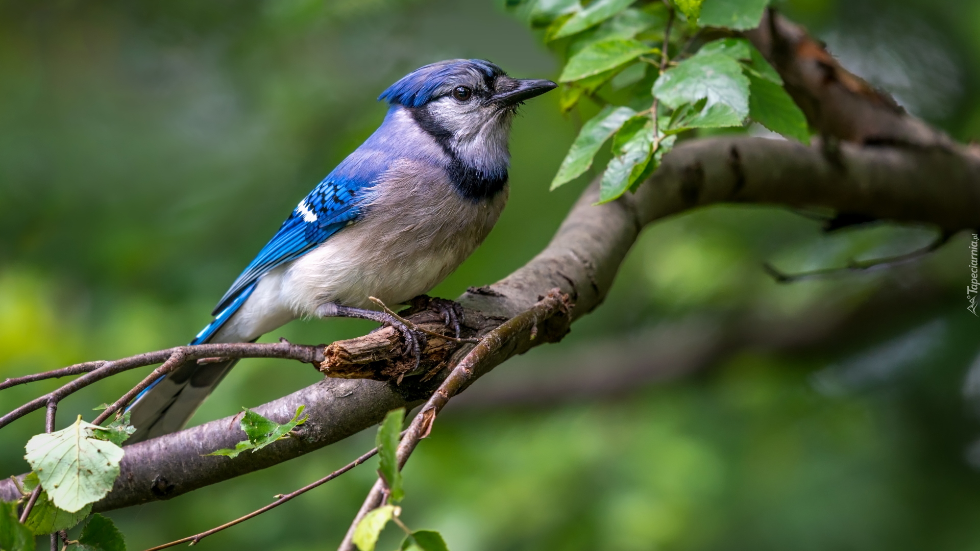 Edytor tapety: Modrosójka błękitna na gałęzi wśród liści