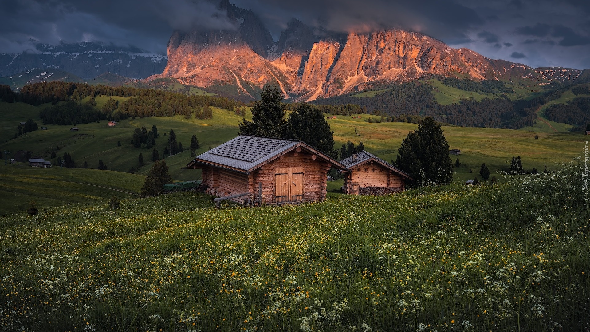 Edytor tapety: Drewniane domki na łące i góry Sassolungo