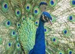 Edytor tapety: Niebiesko-zielony paw z rozłożonym ogonem