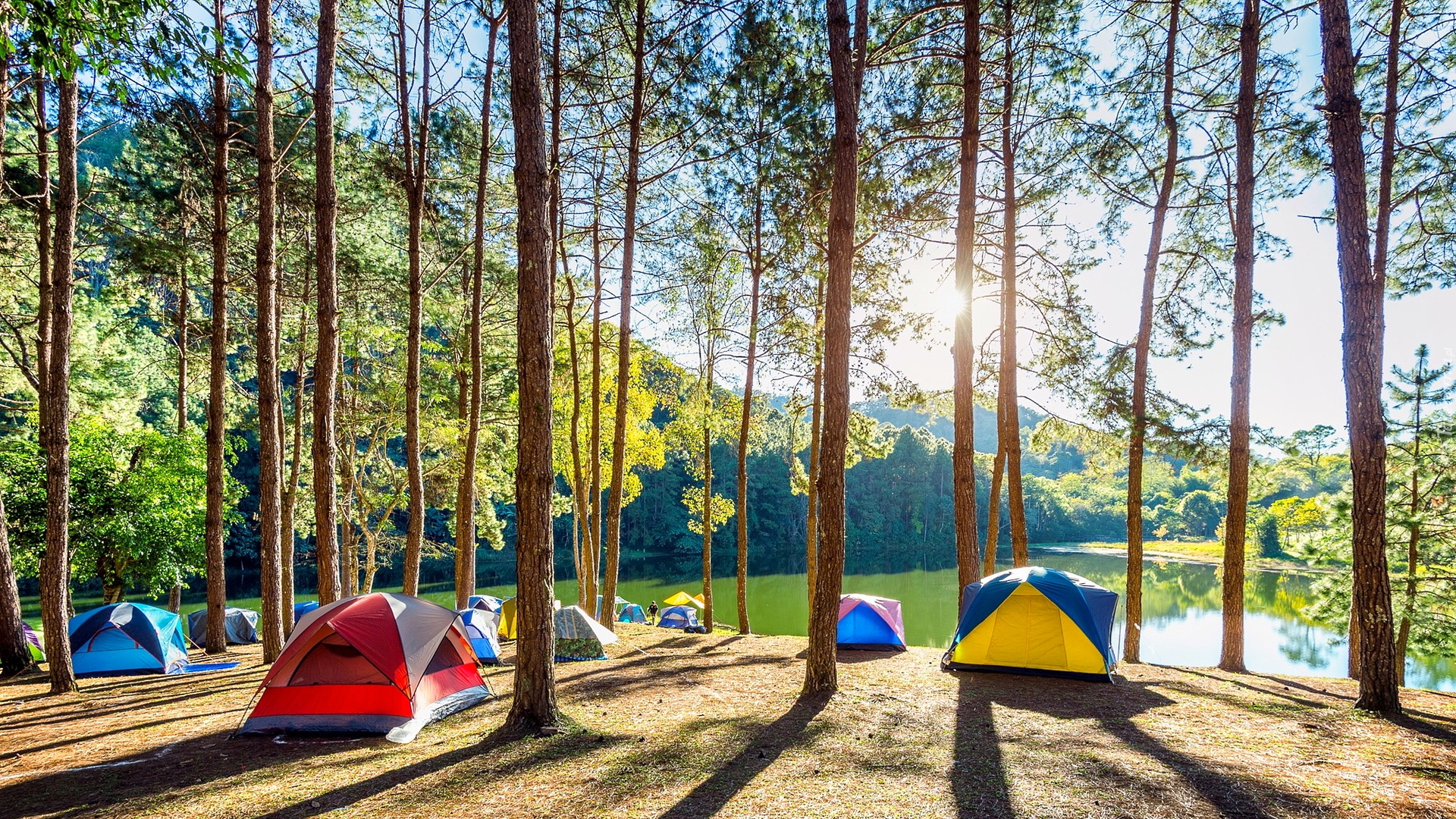Edytor tapety: Kolorowe namioty pośród drzew nad jeziorem Pang Oung