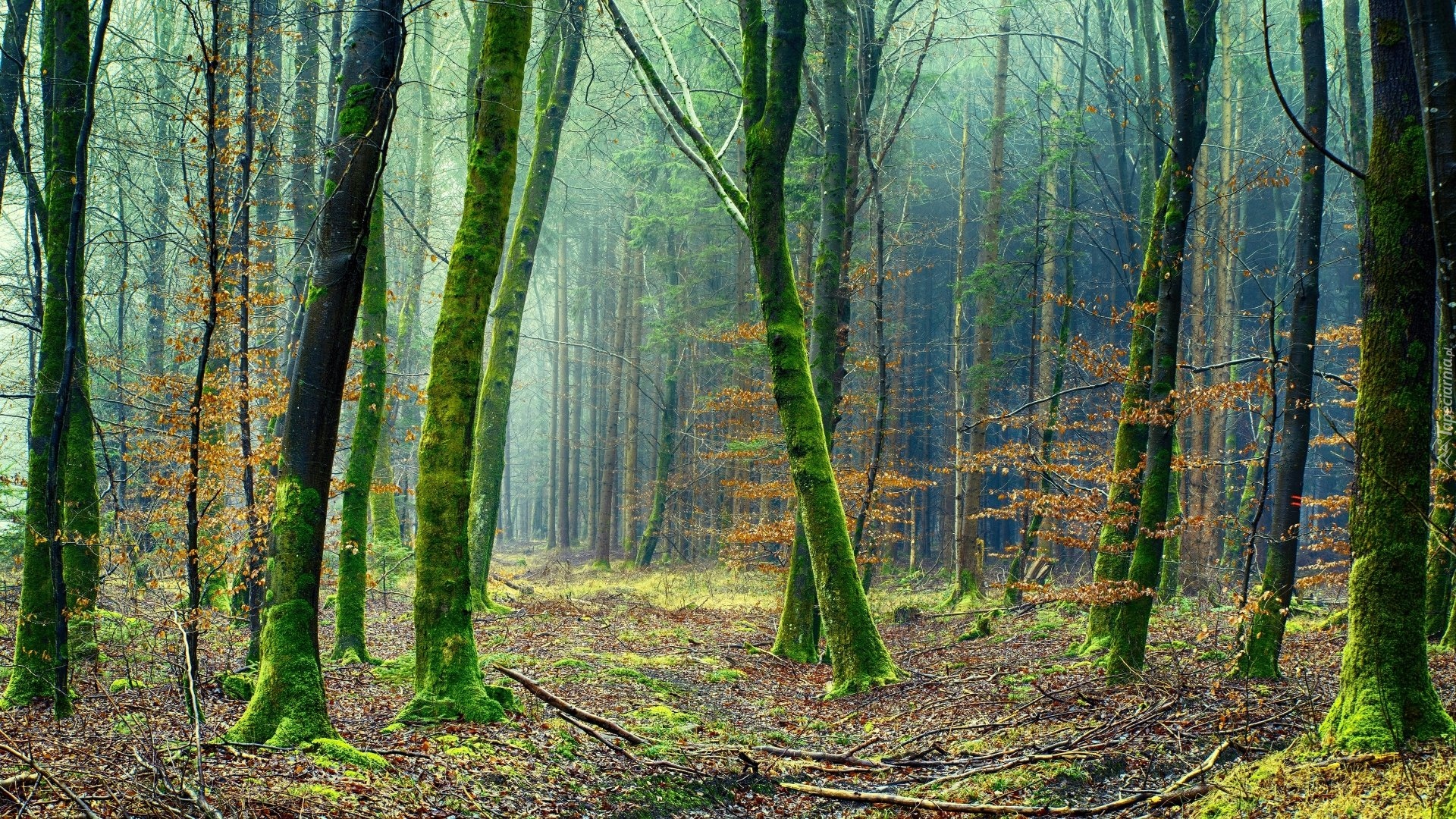 Edytor tapety: Suche gałęzie pod omszałymi drzewami w lesie