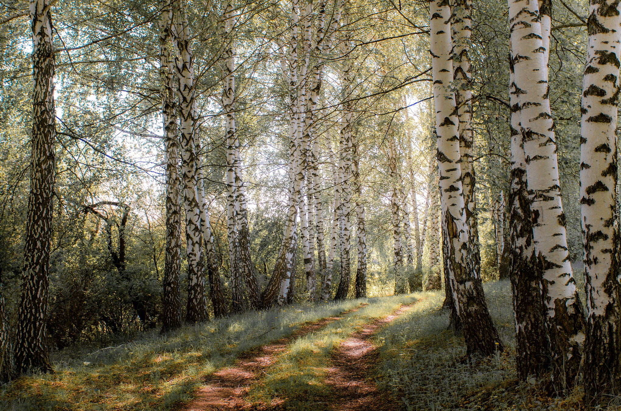 Edytor tapety: Ścieżka pośród brzóz w lesie