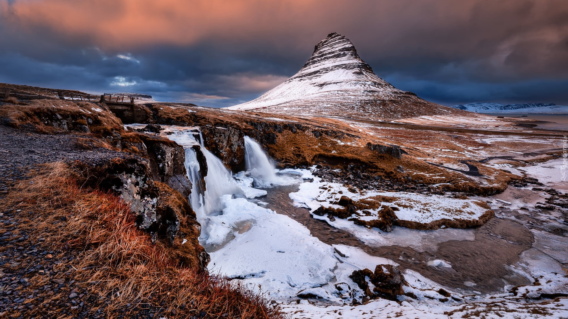 Edytor tapety: Ośnieżona góra Kirkjufell i wodospad Kirkjufellsfoss w Islandii