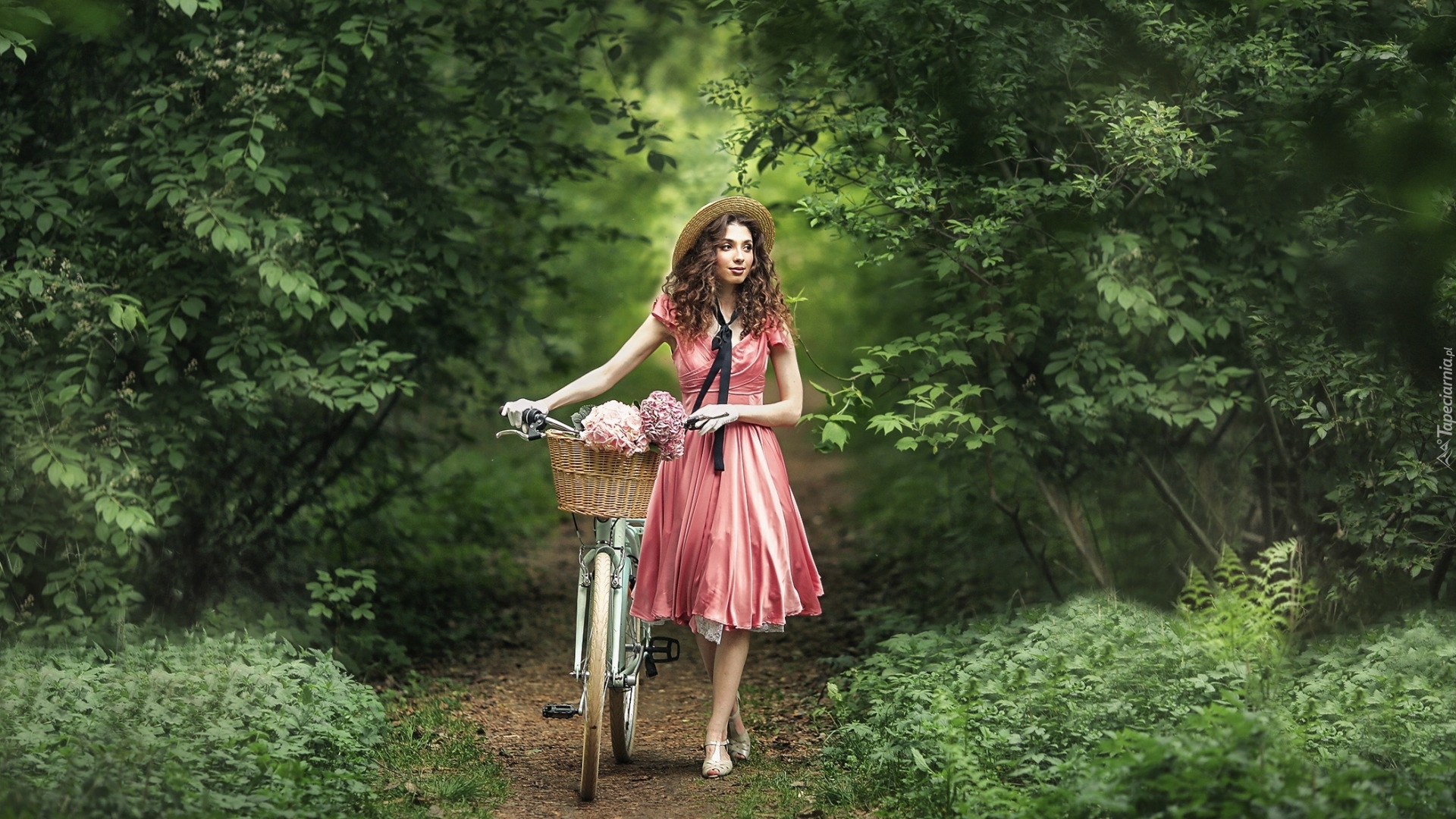 Edytor tapety: Dziewczyna z rowerem na leśnej ścieżce