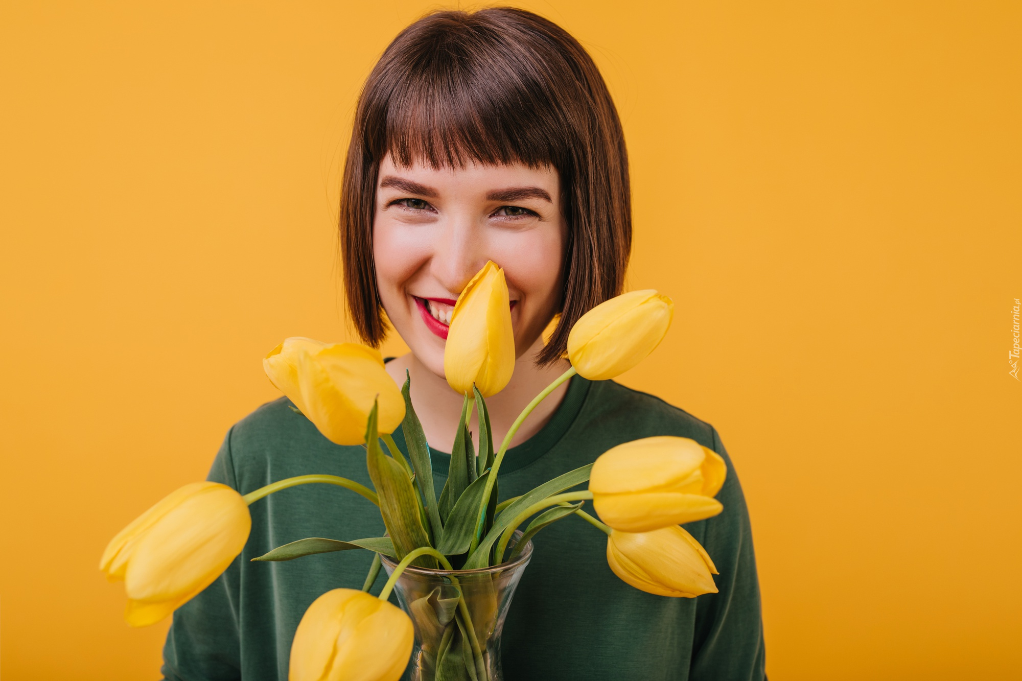 Edytor tapety: Uśmiechnięta kobieta z żółtymi tulipanami