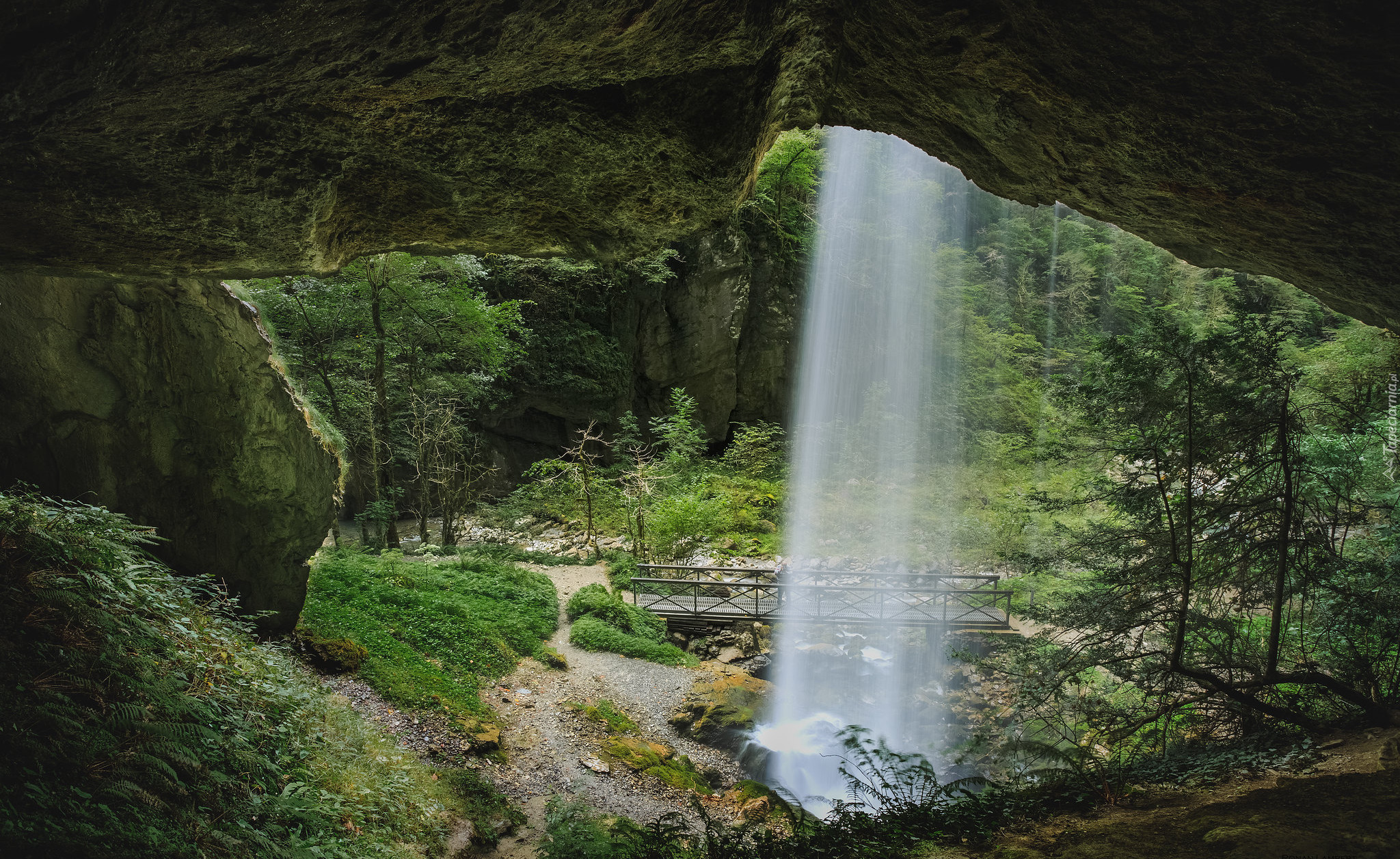 Edytor tapety: Wodospad spadający ze skał do rzeki obok mostka