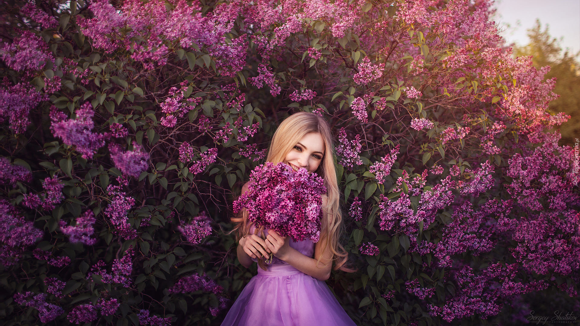 Edytor tapety: Kobieta z bukietem bzu pod krzewem