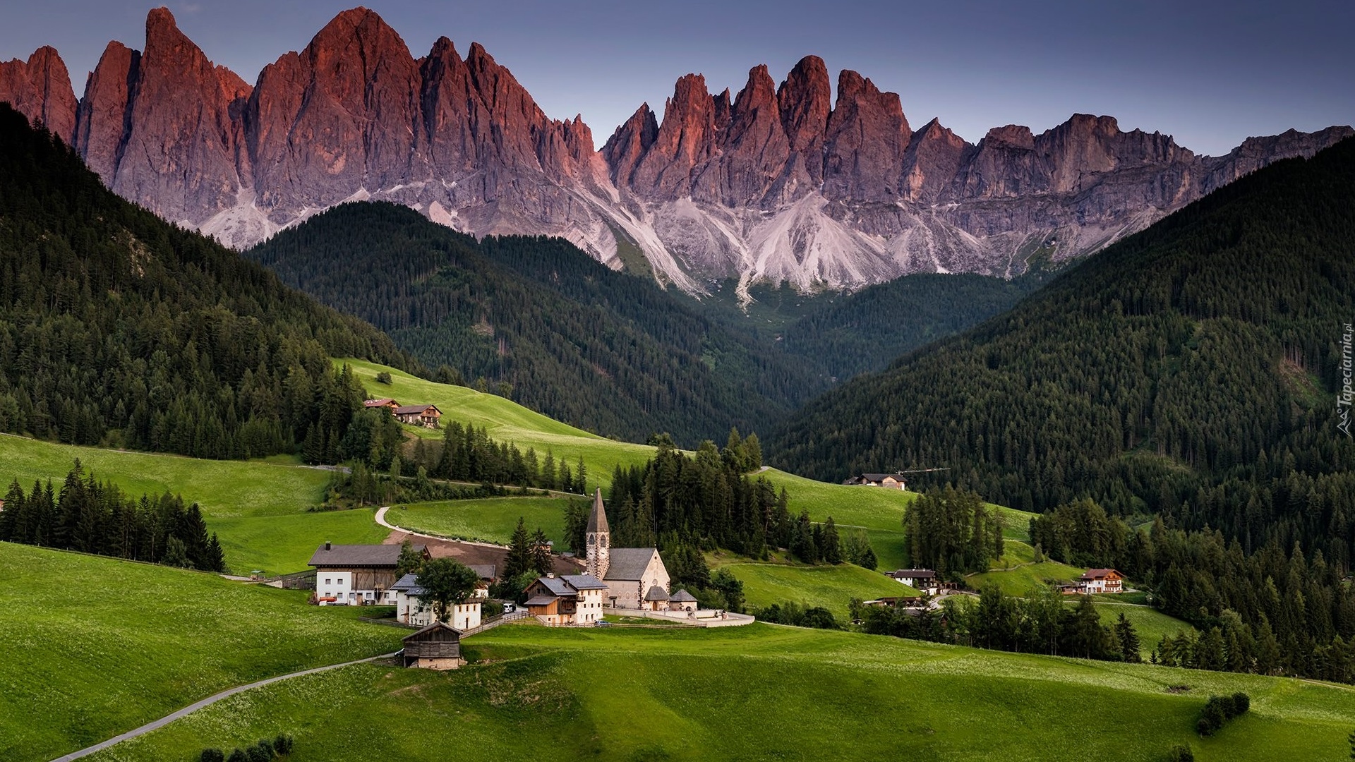 Edytor tapety: Wieś Santa Maddalena na tle masywu Odle