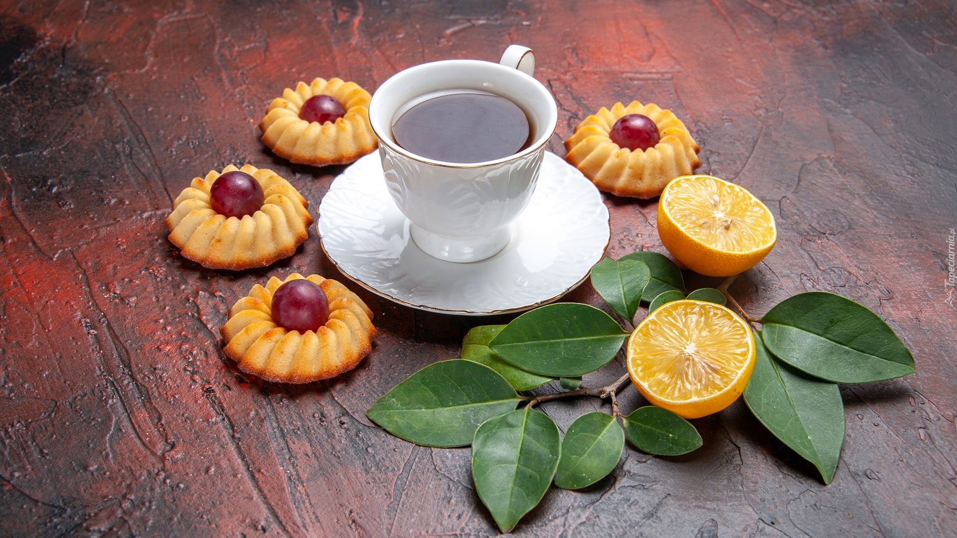 Edytor tapety: Ciasteczka i cytryny obok herbaty w filiżance
