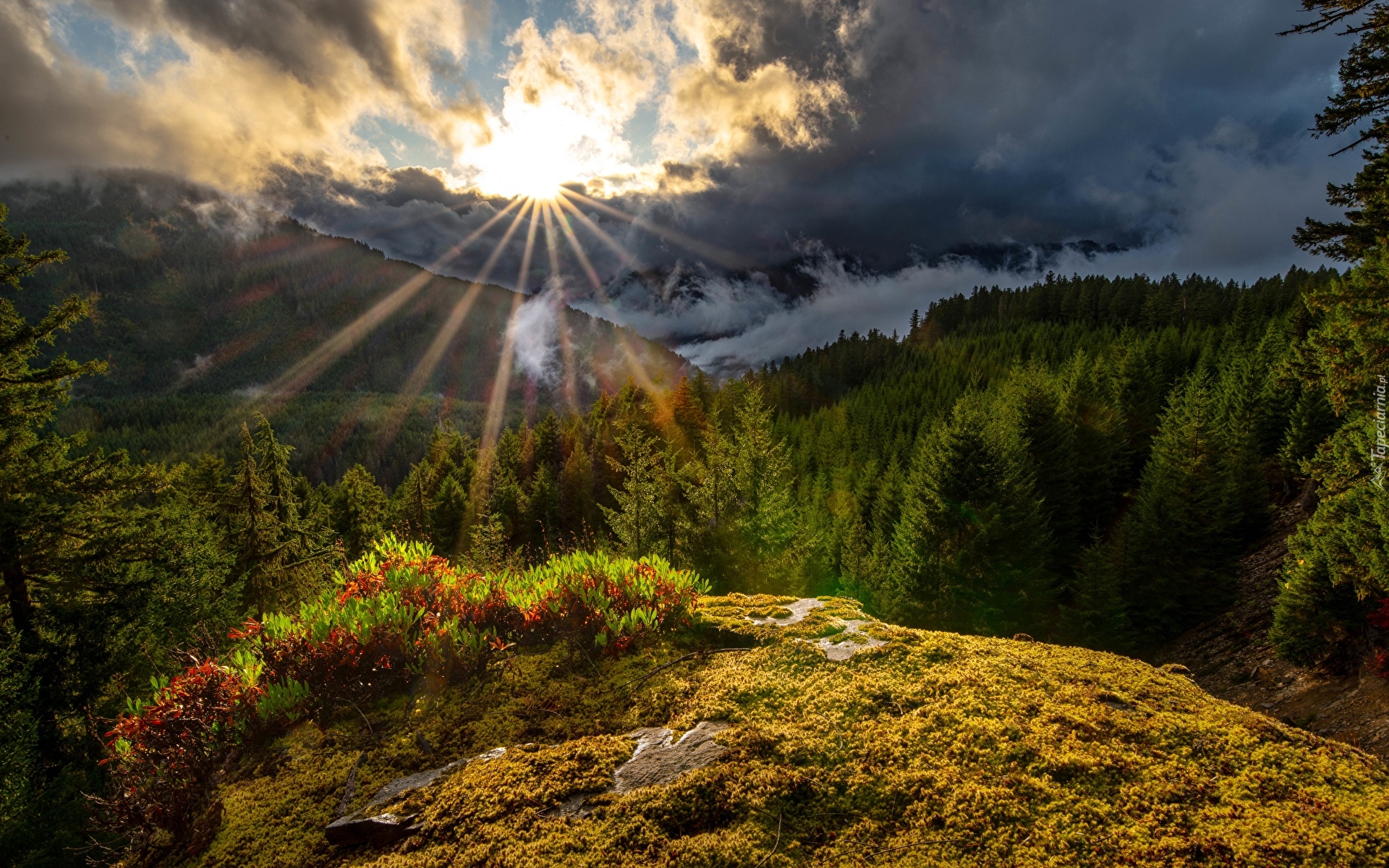 Edytor tapety: Promienie słońca i ciemne chmury nad górami