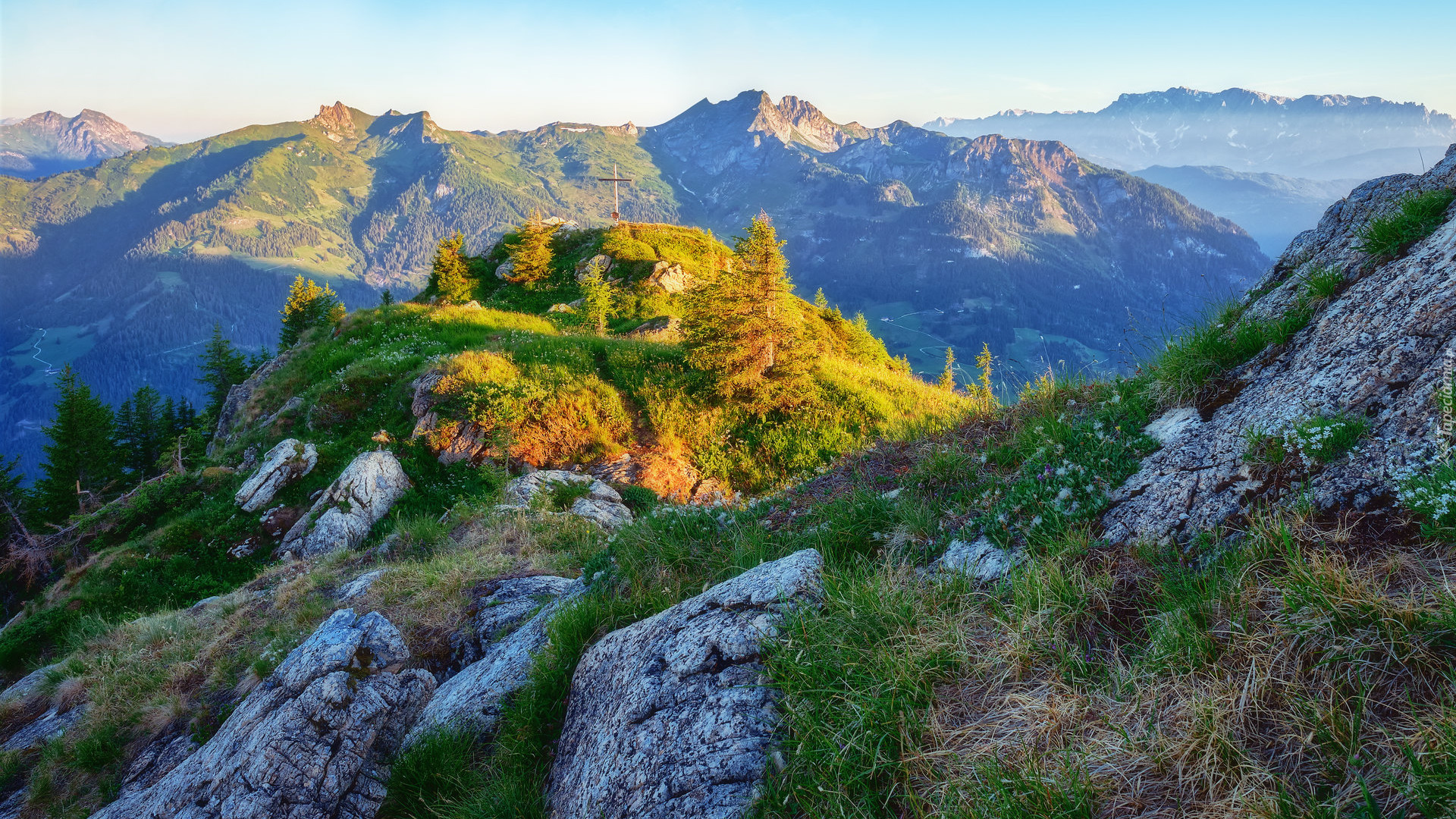 Edytor tapety: Krzyż na porośniętej trawą skale w górach