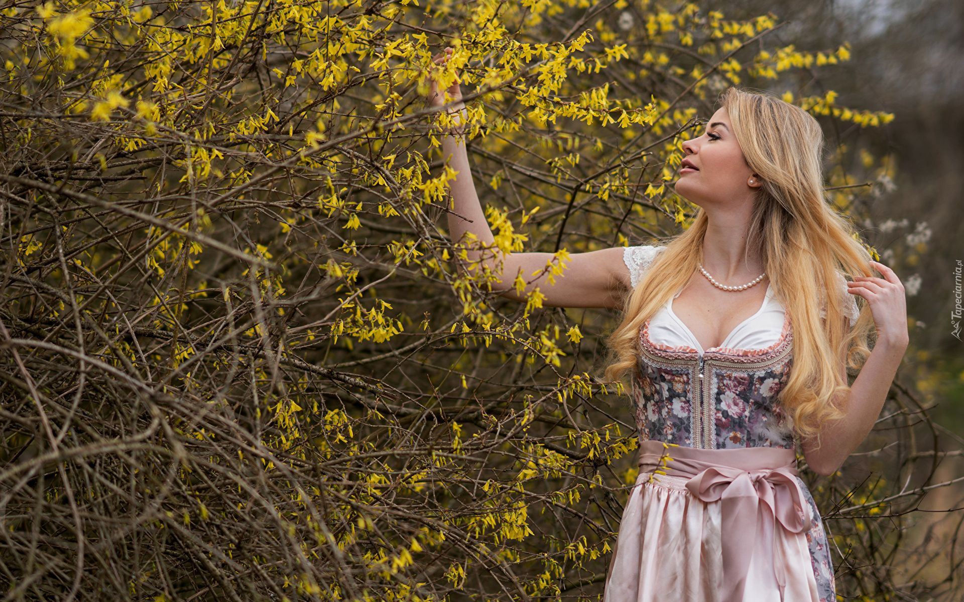 Edytor tapety: Długowłosa blondynka przy krzewie forsycji
