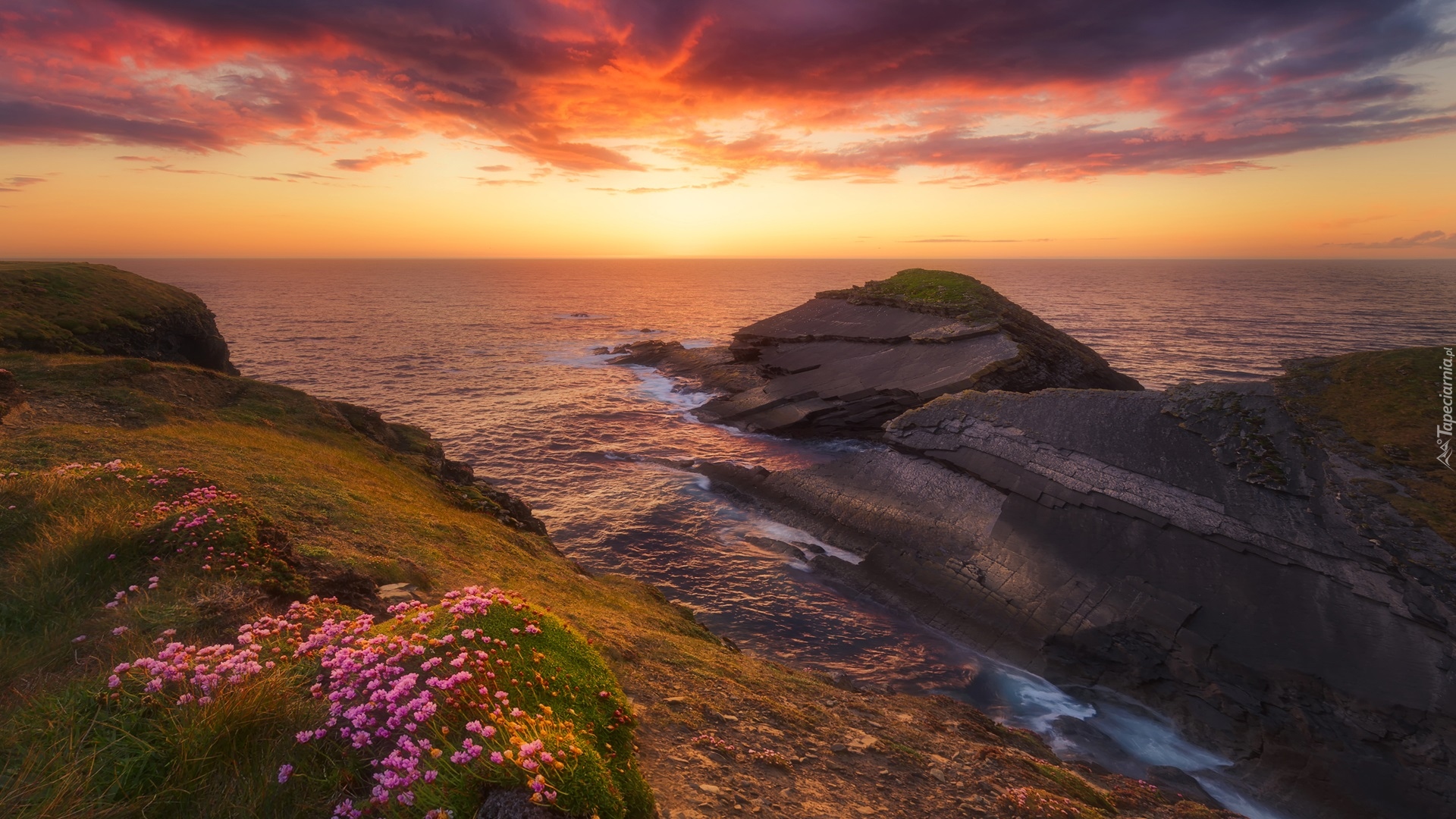 Edytor tapety: Różowe kwiaty na morskim wybrzeżu o zachodzie słońca