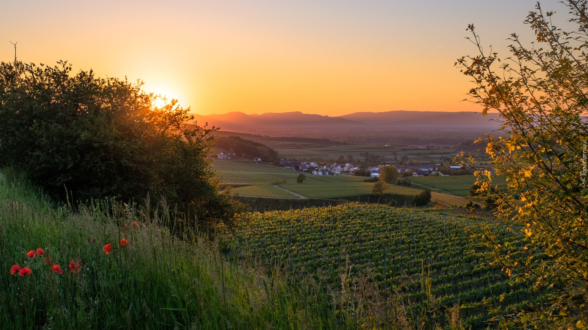 Edytor tapety: Winnice na wzgórzach Kaiserstuhl w blasku wschodzącego słońca