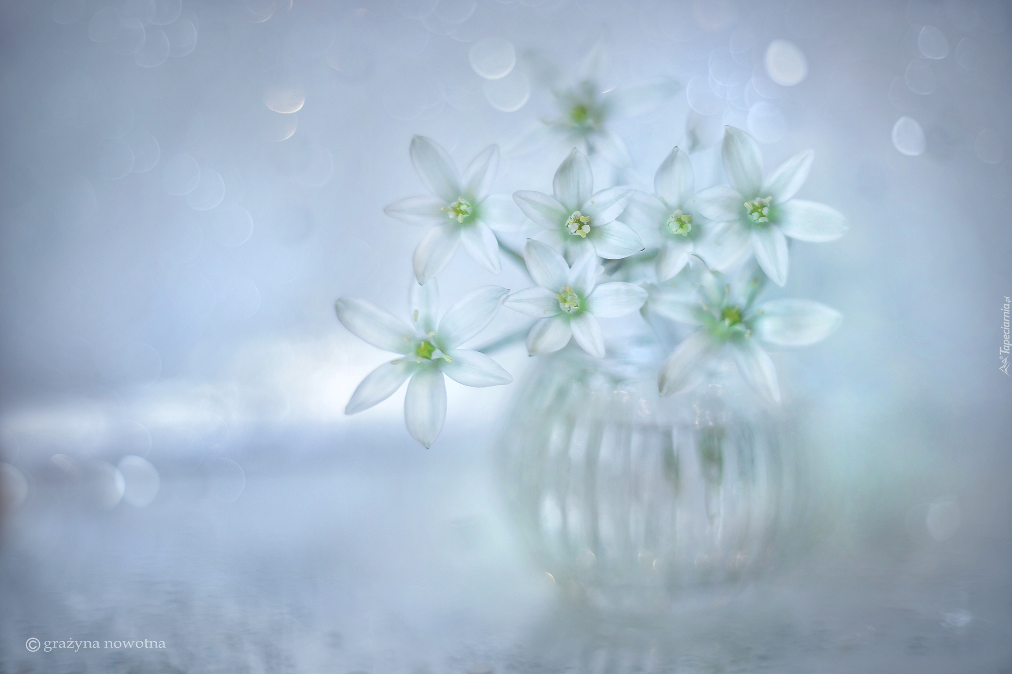 Edytor tapety: Białe kwiatuszki w szklanym wazonie