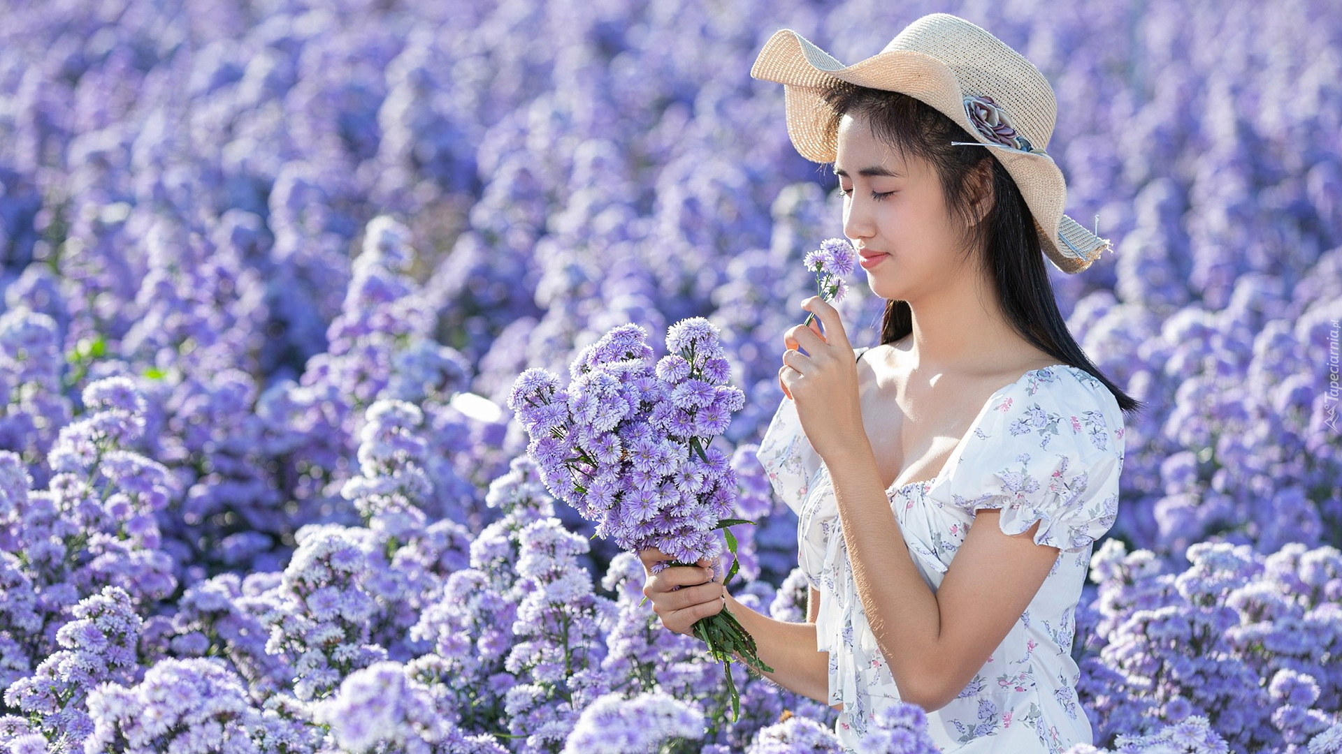 Edytor tapety: Azjatka w kapeluszu pośród kwiatów