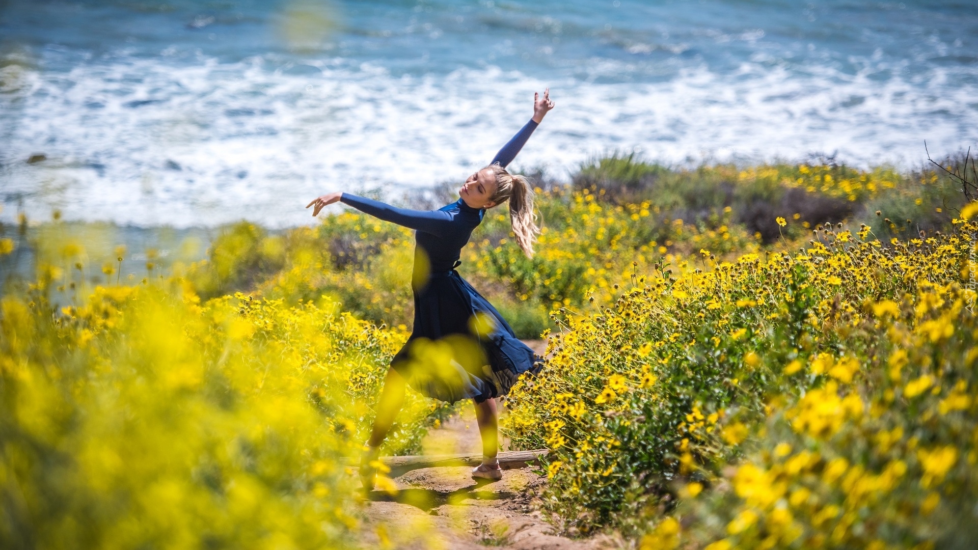 Edytor tapety: Kobieta tańcząca wśród kwiatów nad morzem