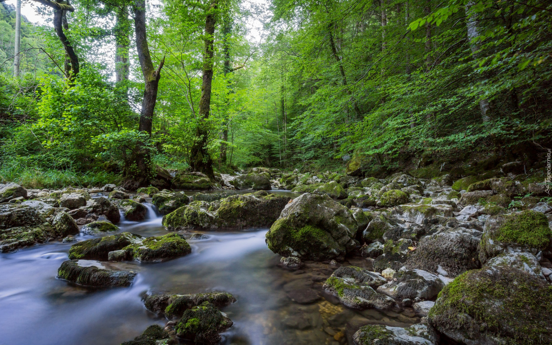 Edytor tapety: Potok i omszałe kamienie w zielonym lesie
