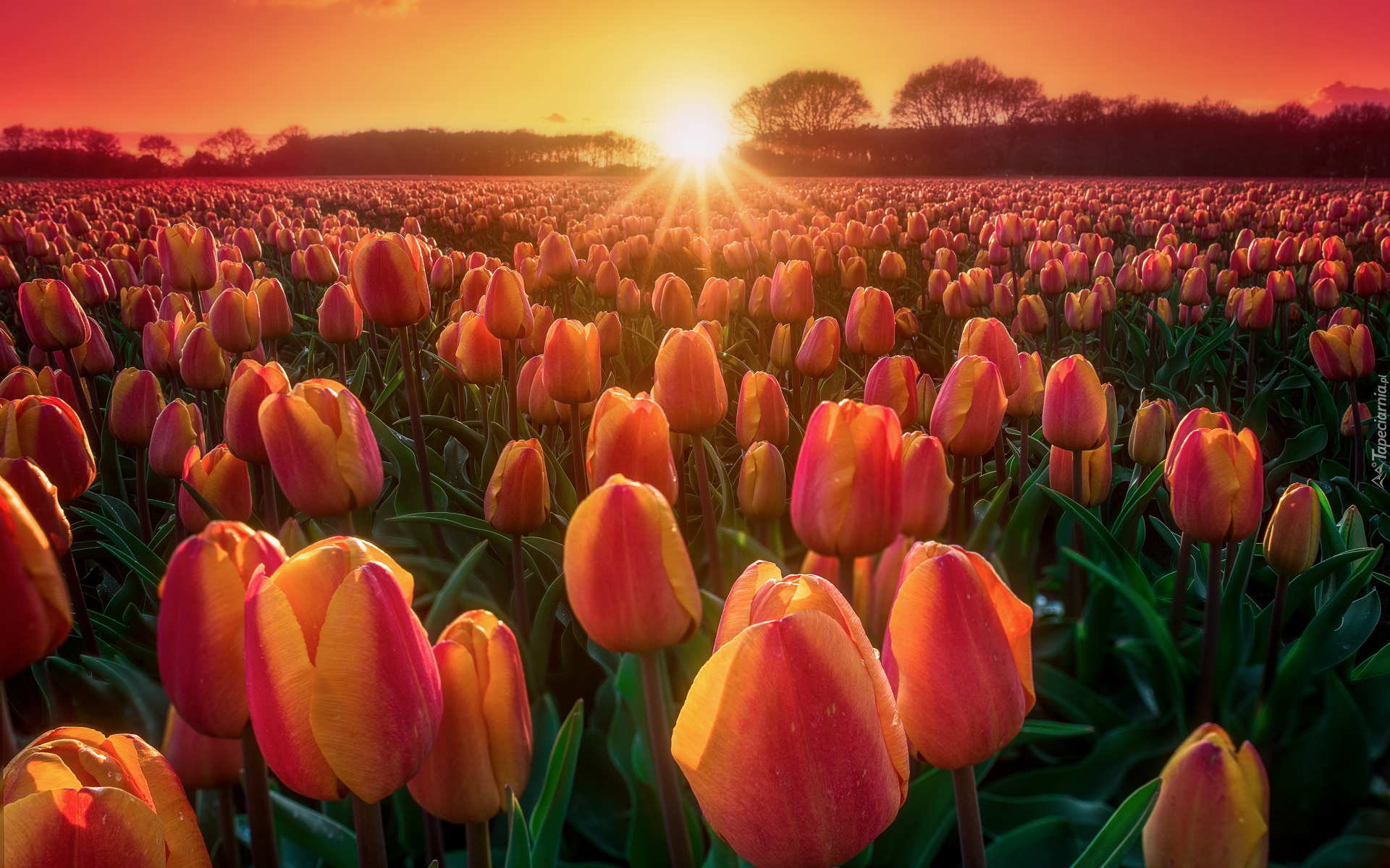 Edytor tapety: Zachód słońca nad polem kwitnących tulipanów