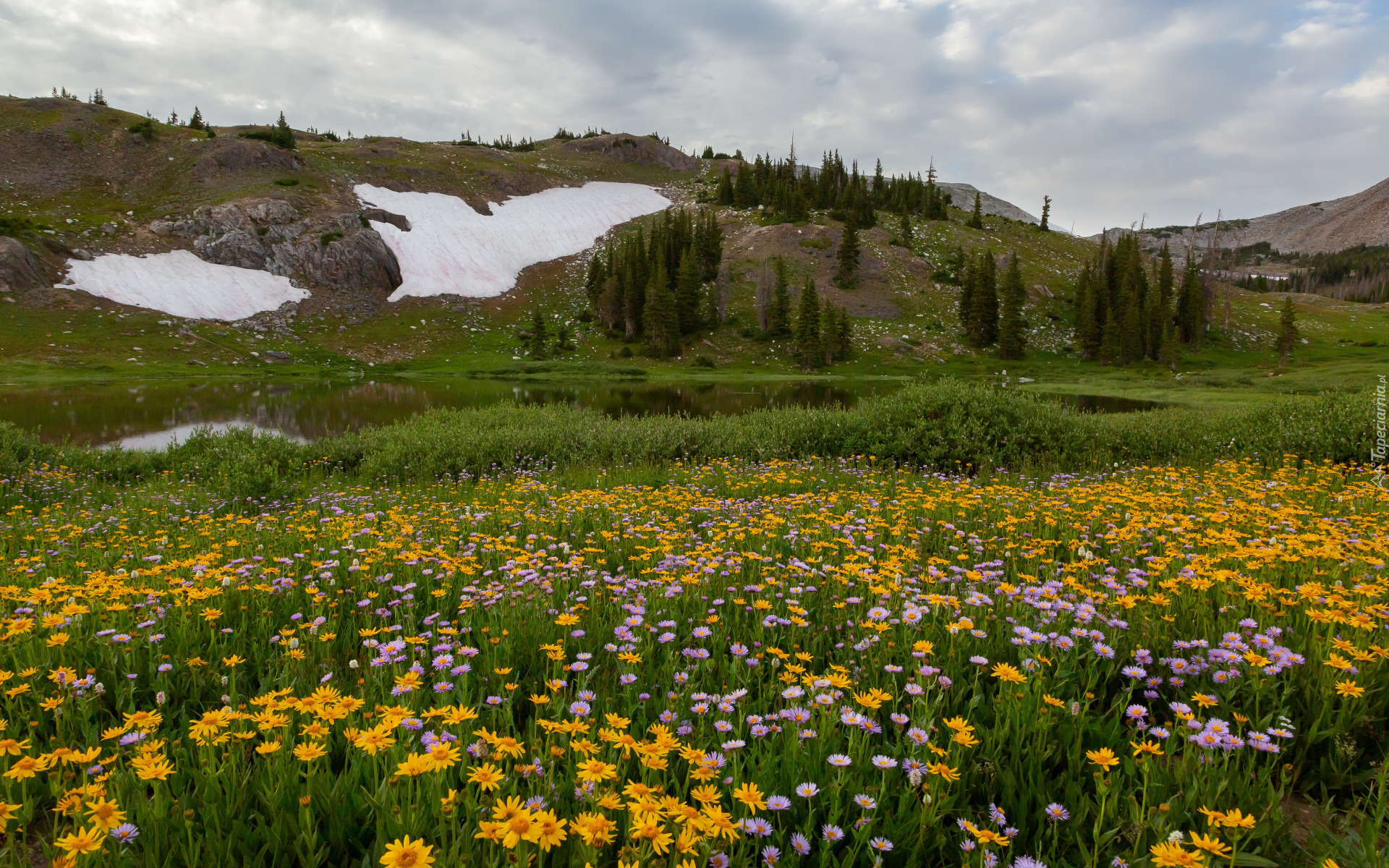 Edytor tapety: Kwiaty na łące i góry w tle