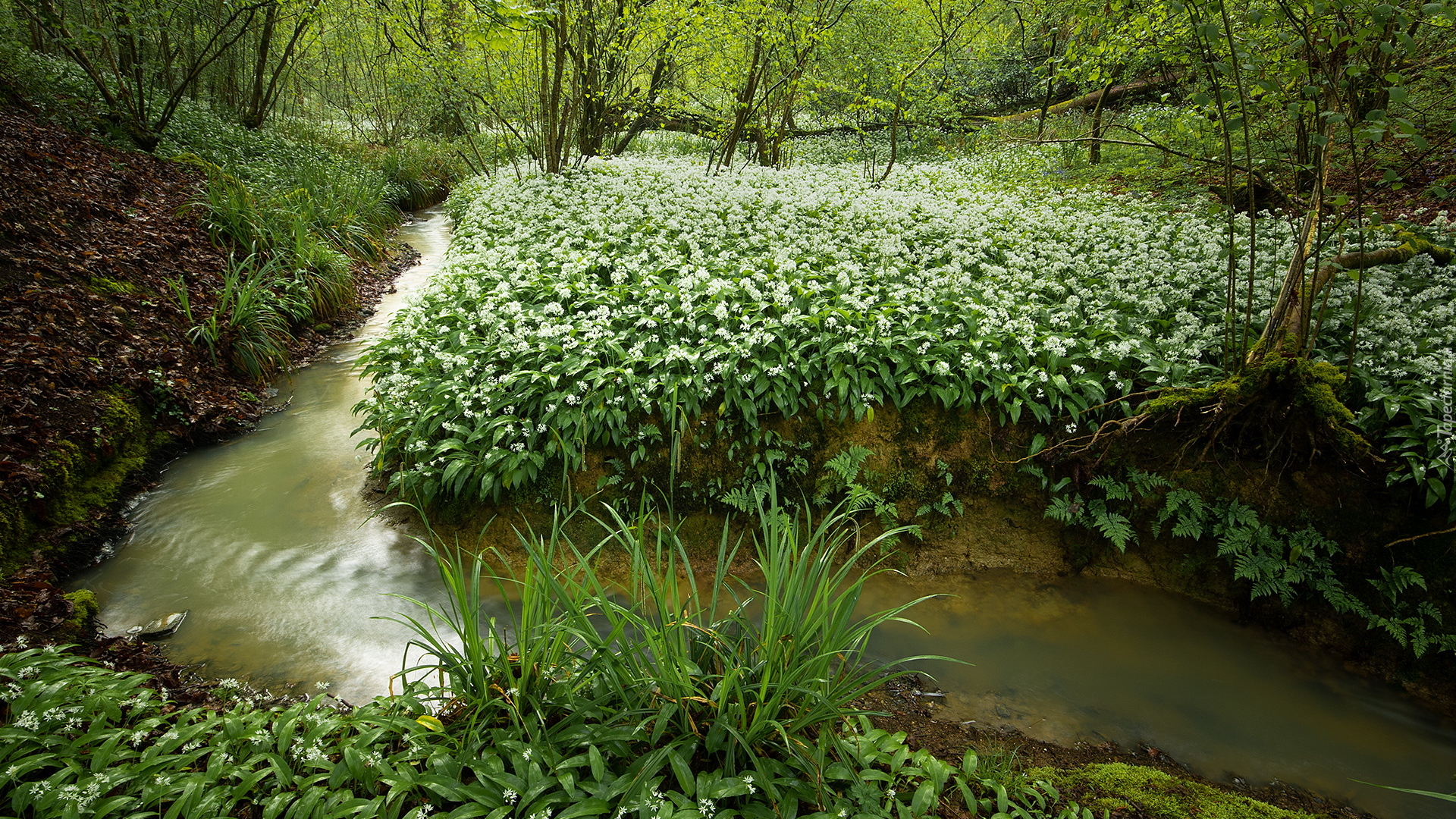 Edytor tapety: Kwitnący czosnek niedźwiedzi przy leśnym strumyku