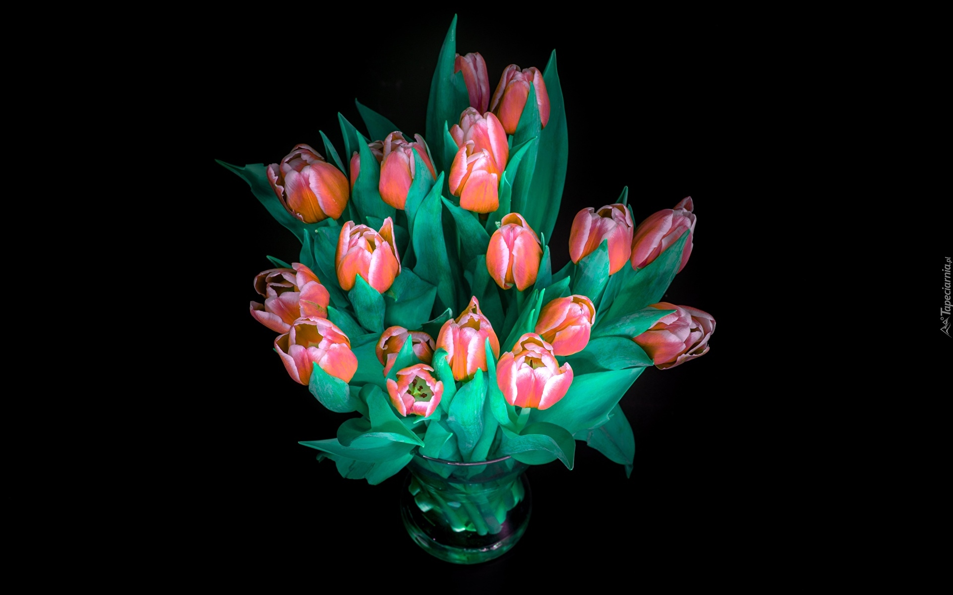 Edytor tapety: Czerwone tulipany w szklanym wazonie na czarnym tle