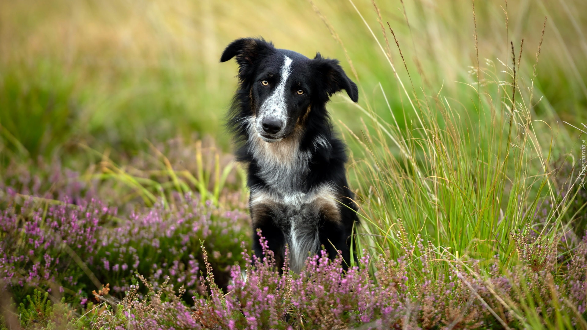 Edytor tapety: Czarno-biały border collie pośród traw i wrzosów