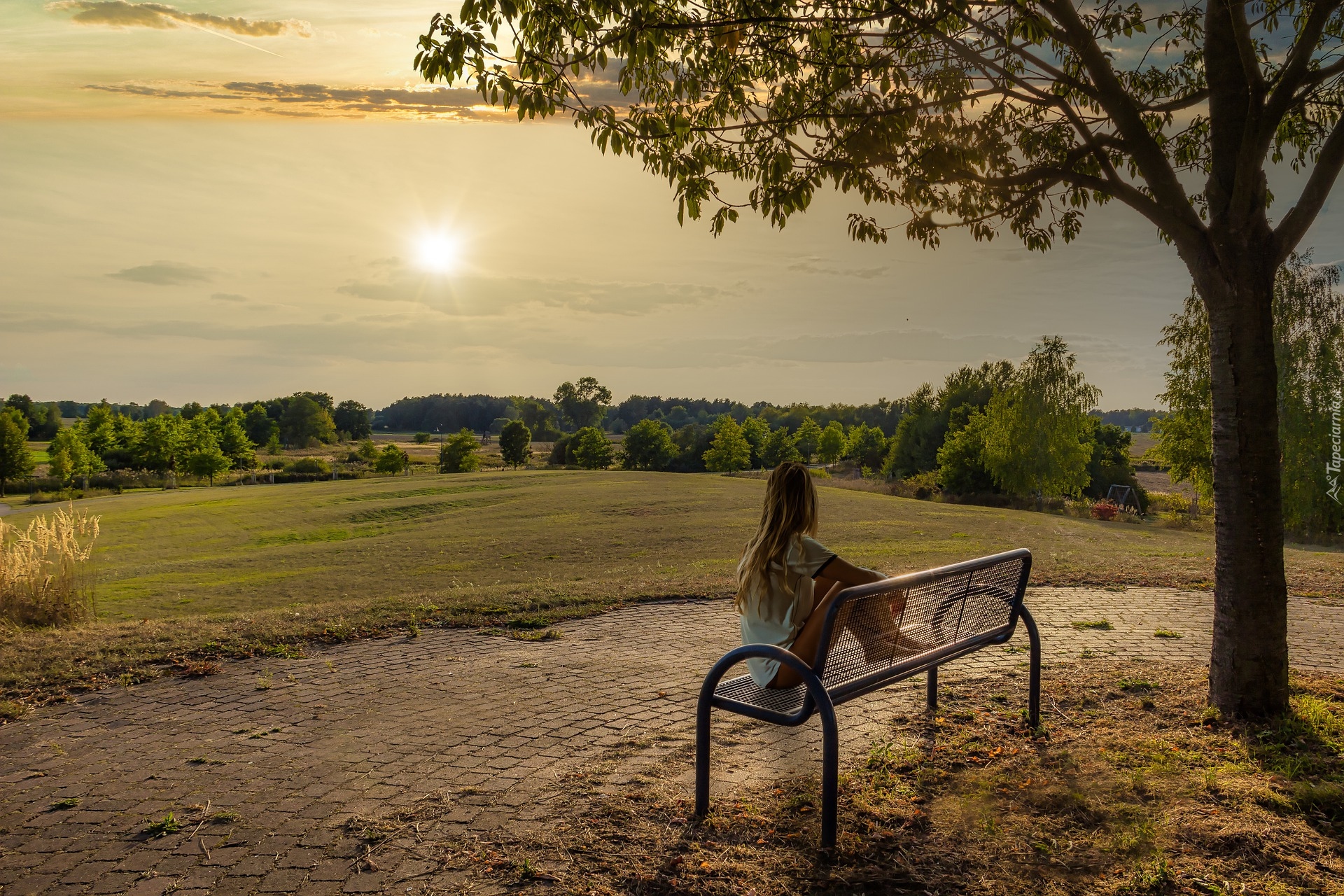 Edytor tapety: Kobieta na ławce pod drzewem