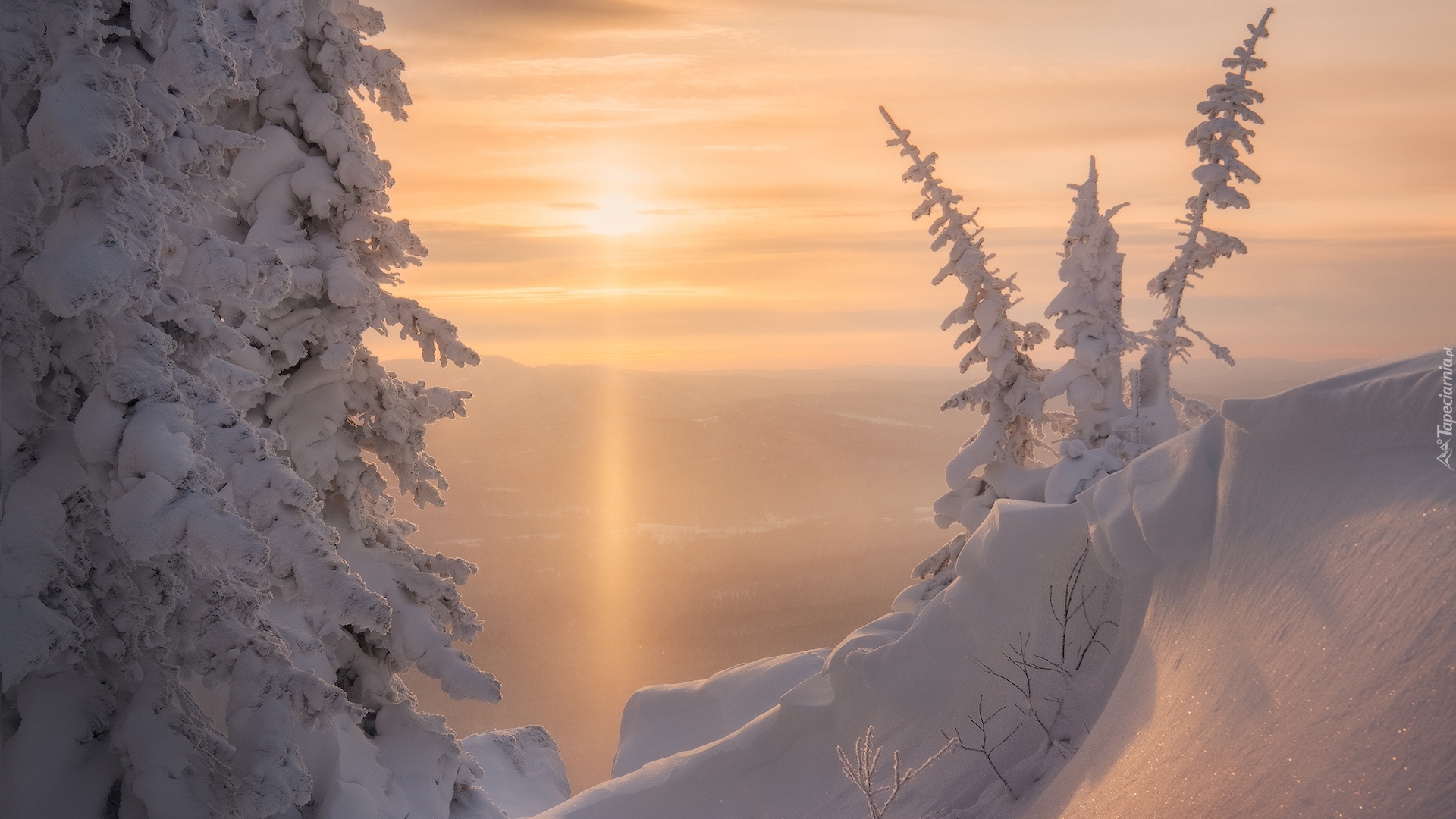 Edytor tapety: Ośnieżone drzewa na tle wschodu słońca nad górami