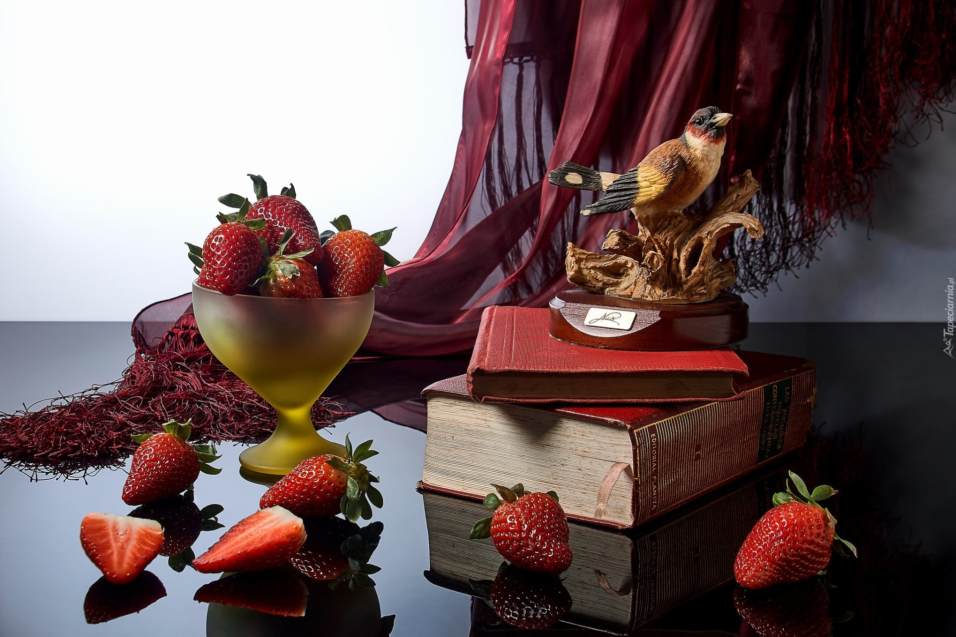 Edytor tapety: Figurka ptaka na książkach obok pucharka z truskawkami