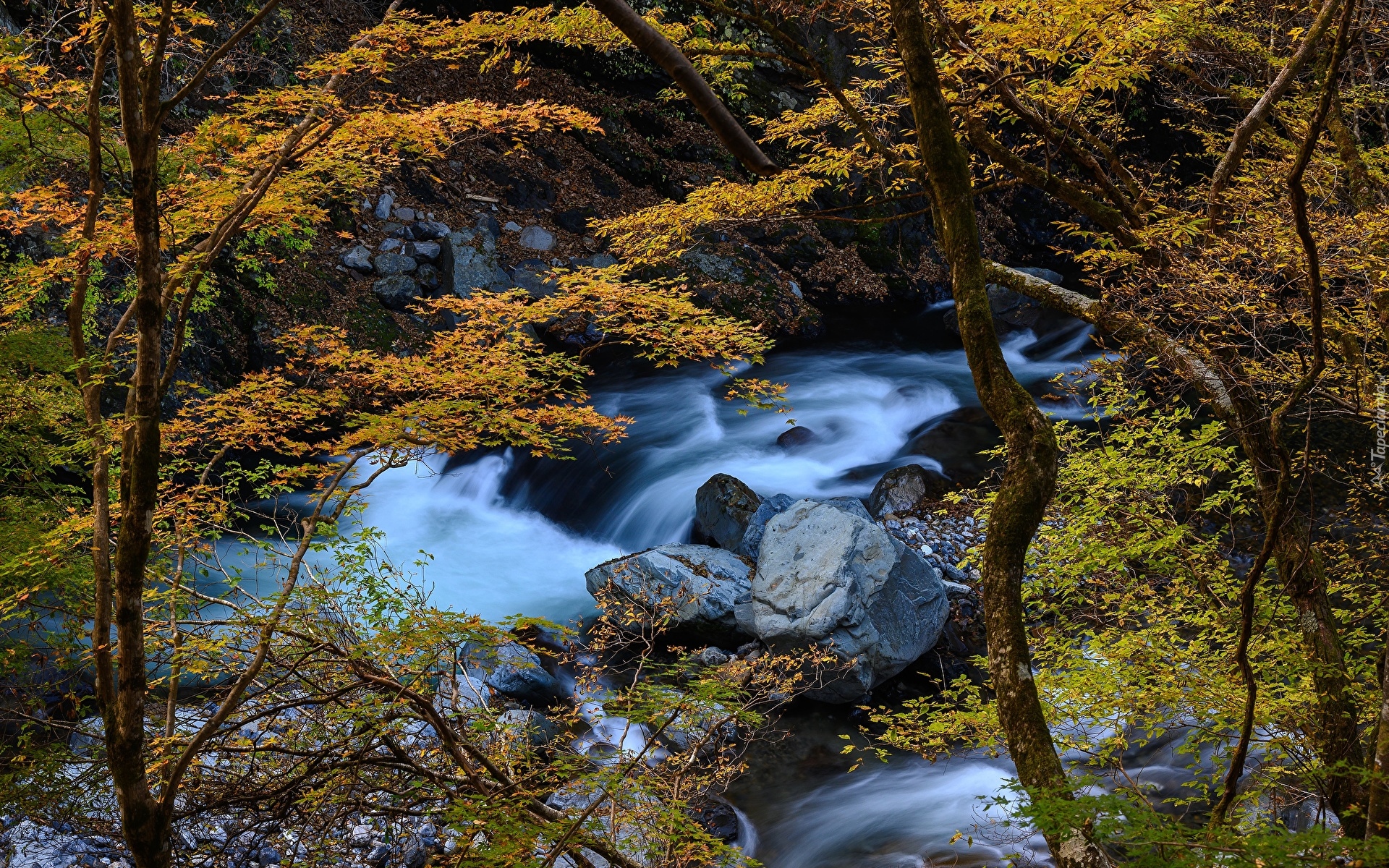 Edytor tapety: Widok zza jesiennych drzew na kamienistą rzekę