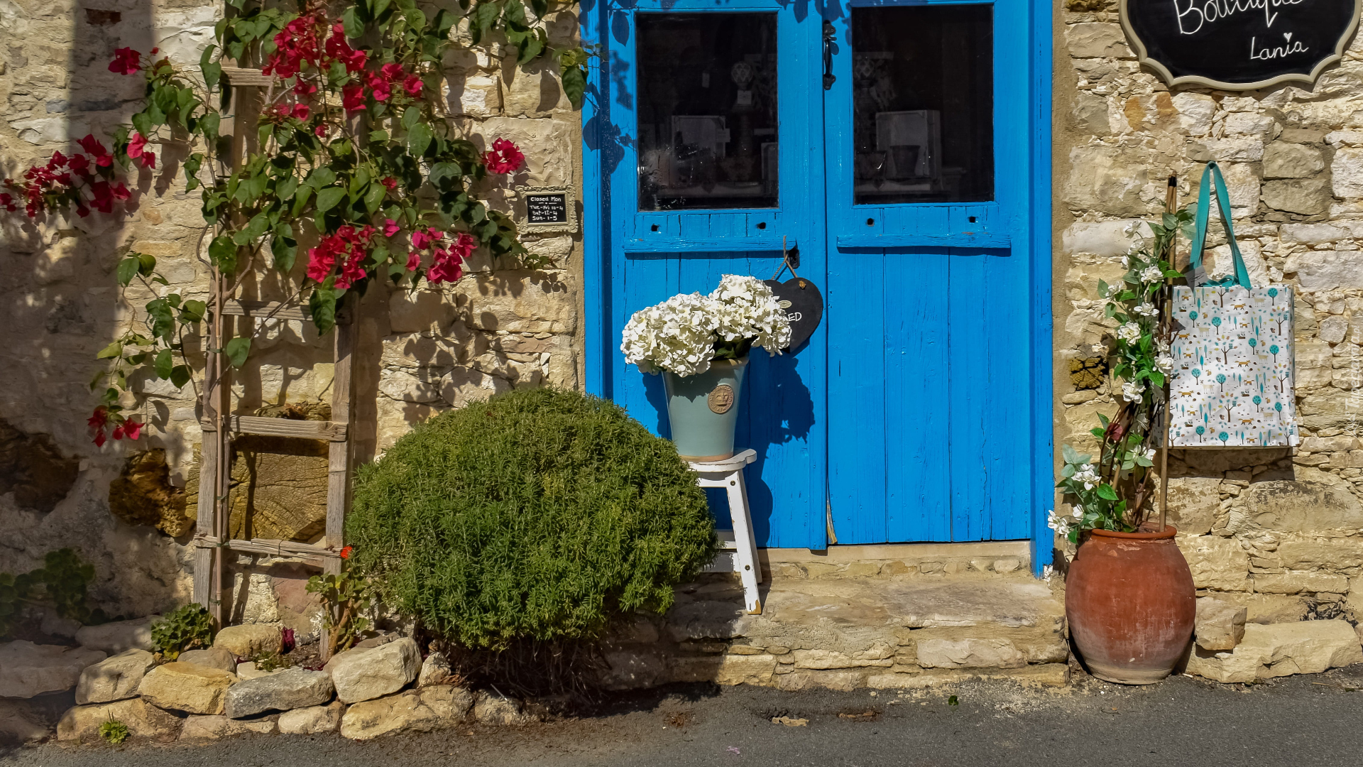 Edytor tapety: Kwiaty przy niebieskich drzwiach domu