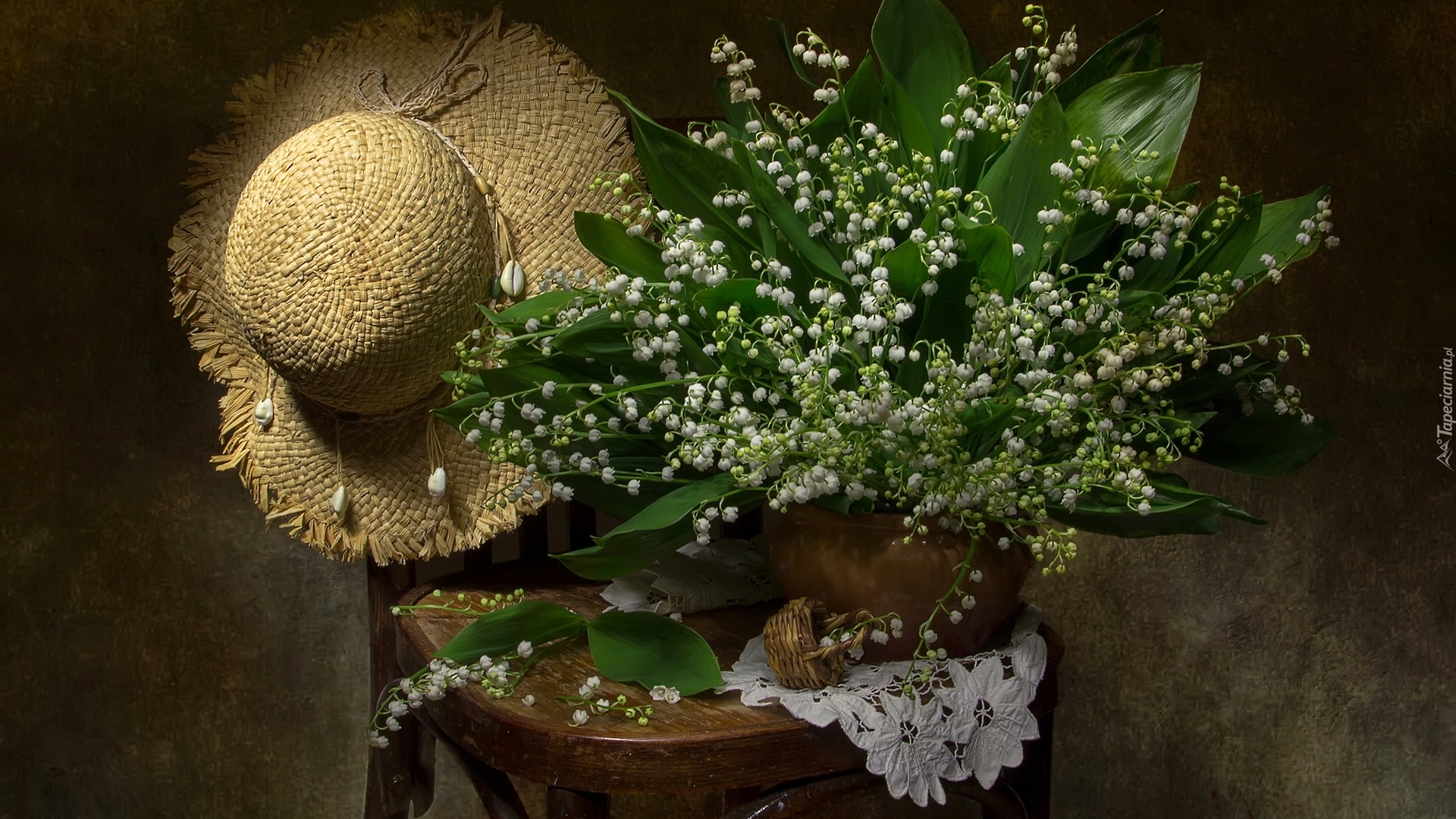 Edytor tapety: Konwalie majowe i kapelusz na krześle