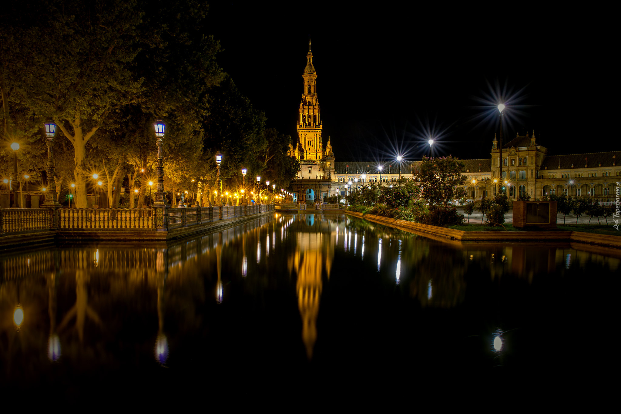 Edytor tapety: Oświetlony nocą Plac Hiszpański w Sewilli