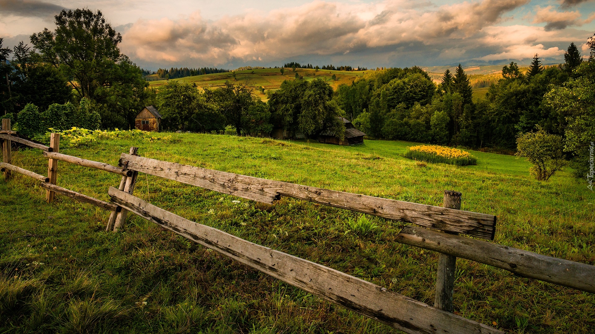 Edytor tapety: Domki pod drzewami na ogrodzonej łące