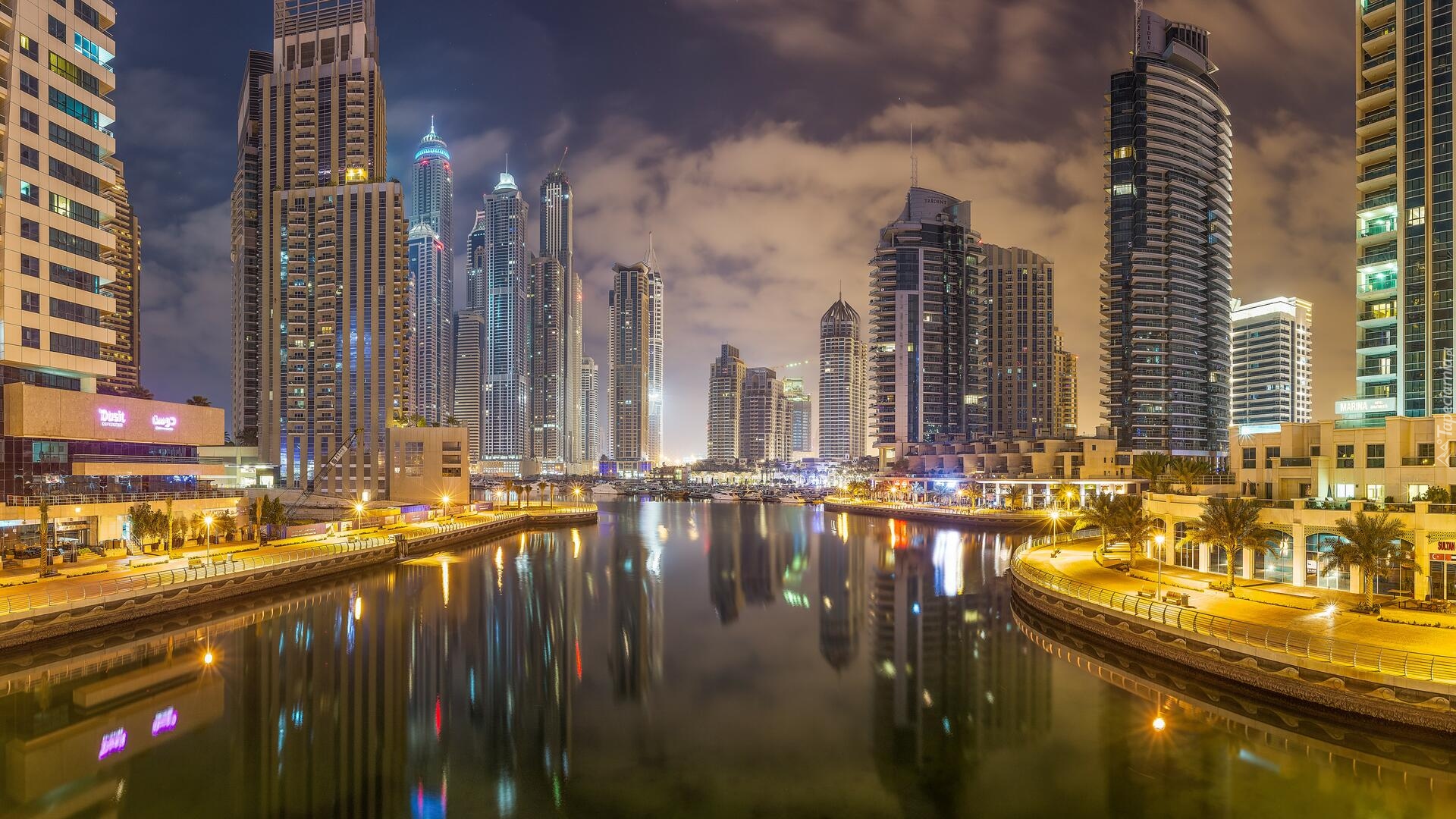 Edytor tapety: Oświetlone wieżowce nad rzeką Dubai Creek w Dubaju