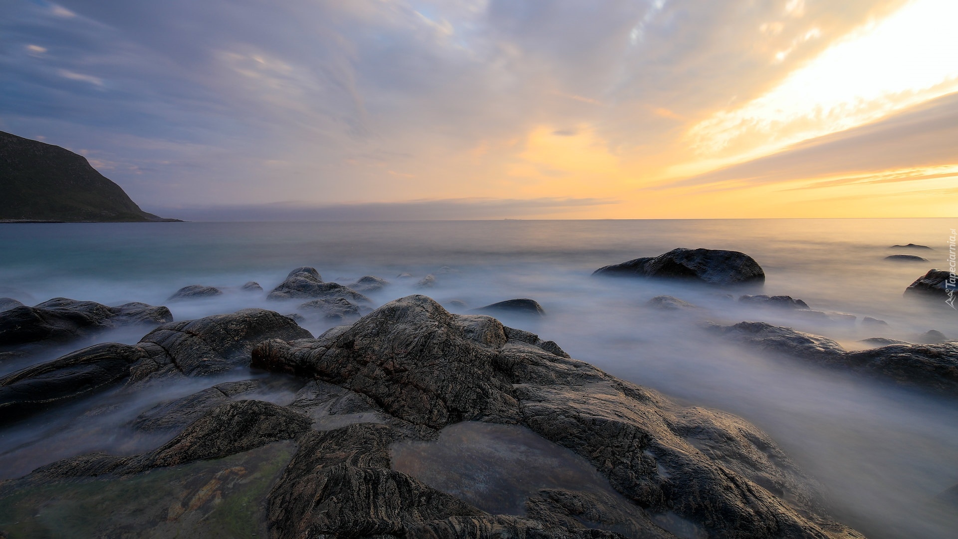 Edytor tapety: Skały na morzu o wschodzie słońca