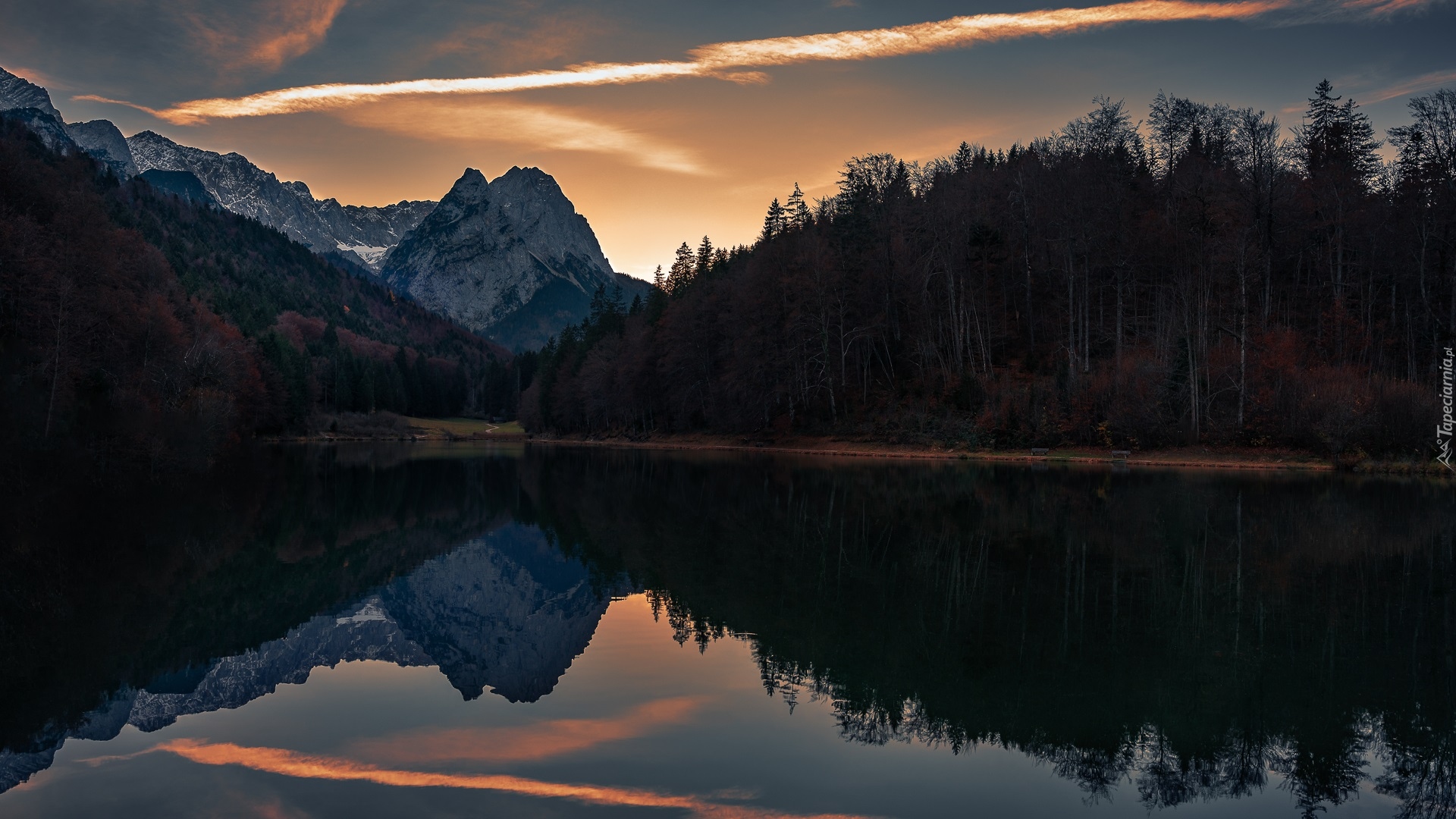Edytor tapety: Zachód słońca nad górami i jeziorem