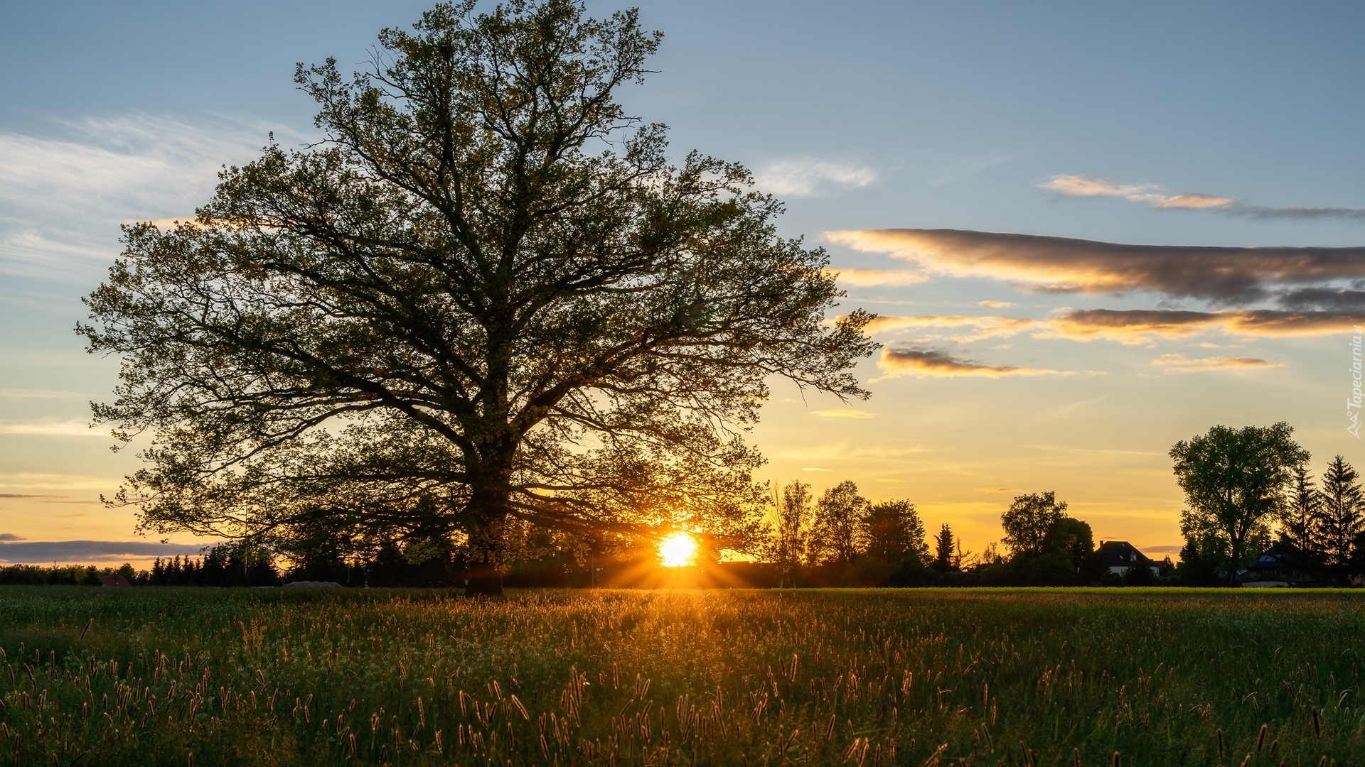 Edytor tapety: Drzewo na łące w promieniach słonecznych