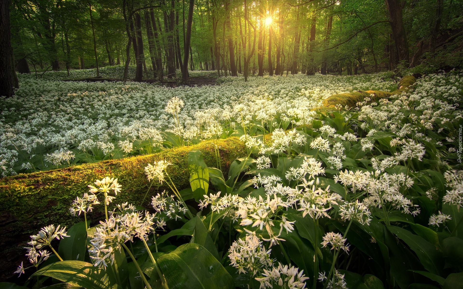 Edytor tapety: Kwitnący czosnek niedźwiedzi w słonecznym lesie