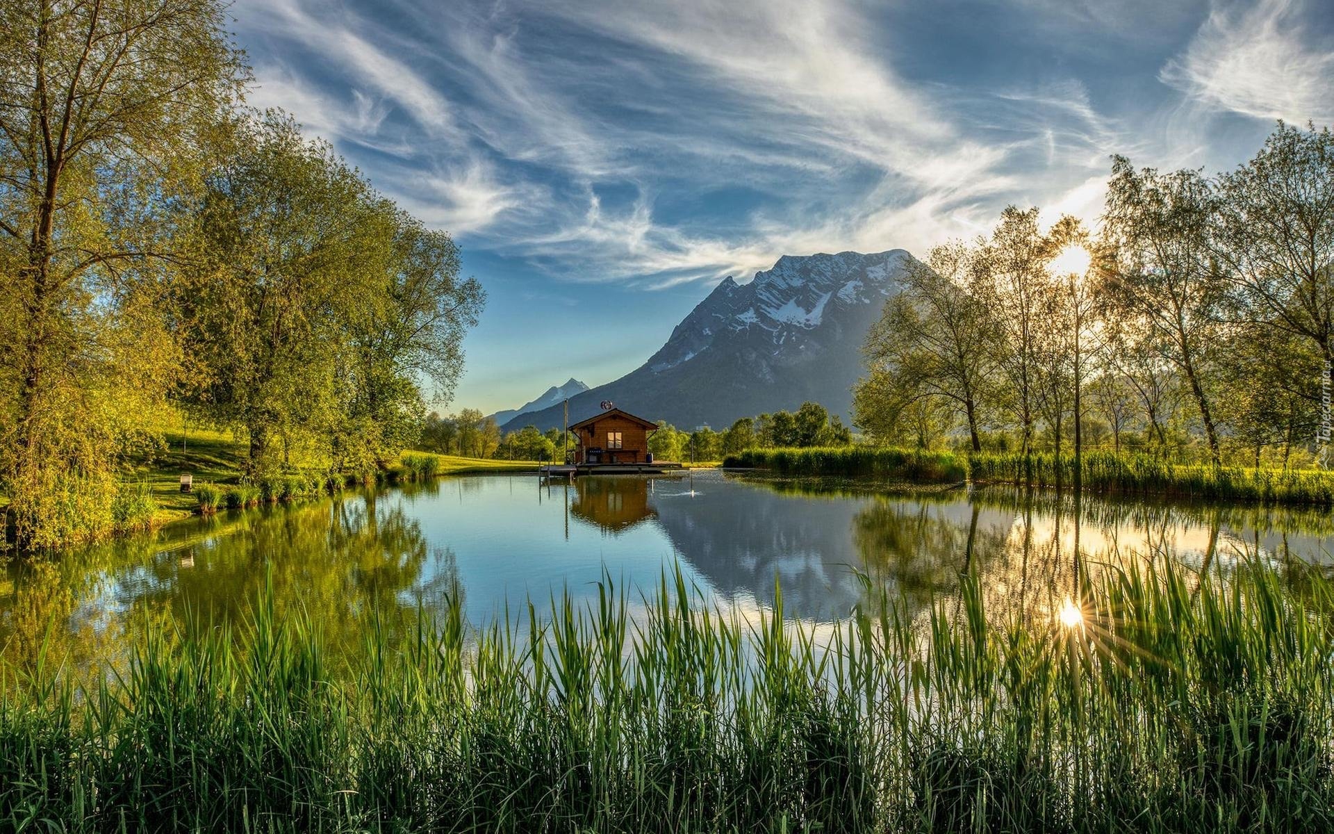 Edytor tapety: Dom nad górskim jeziorem w słonecznym blasku