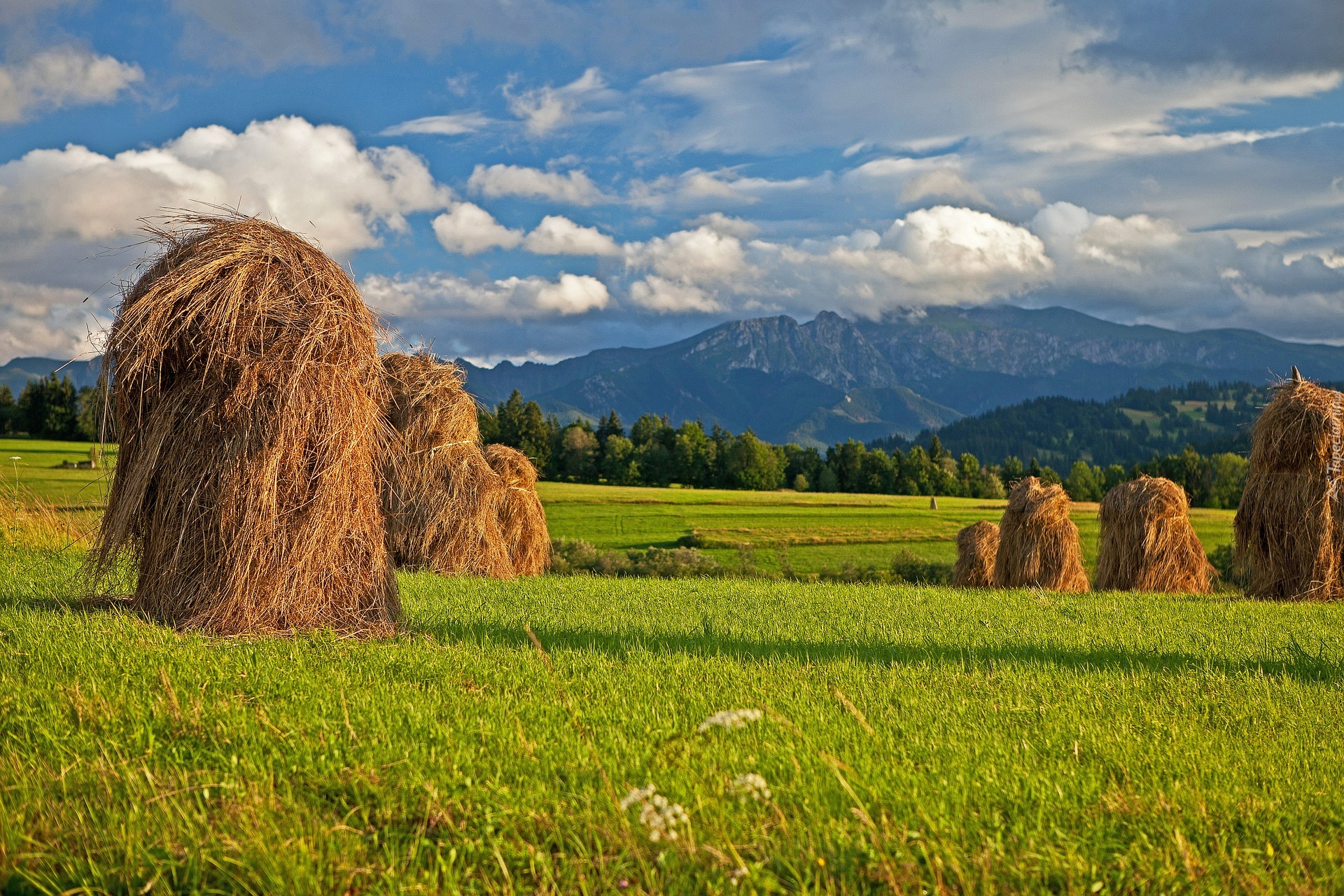 Edytor tapety: Snopki siana na górskiej polanie w Tatrach