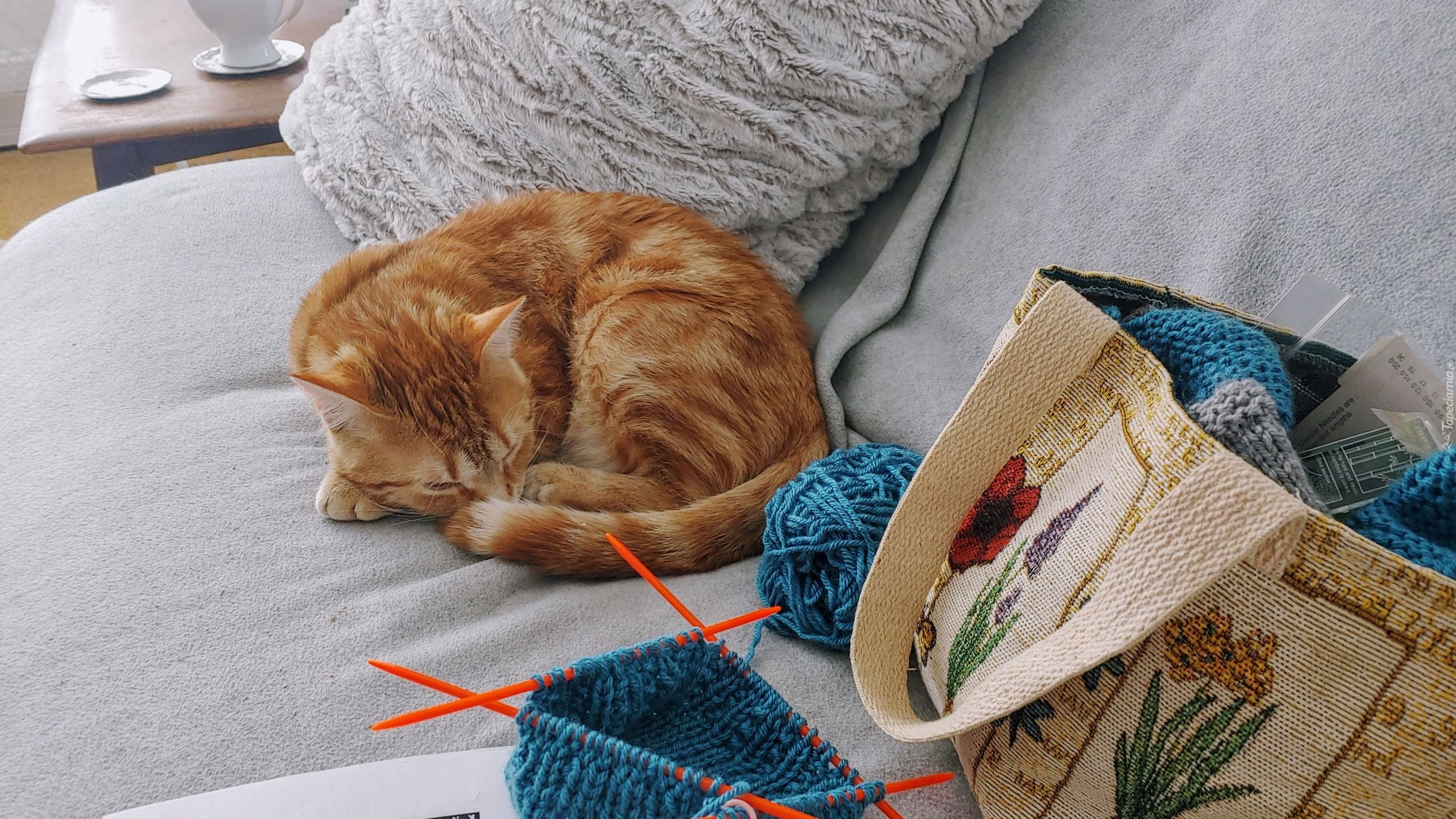 Edytor tapety: Śpiący rudy kot na kanapie