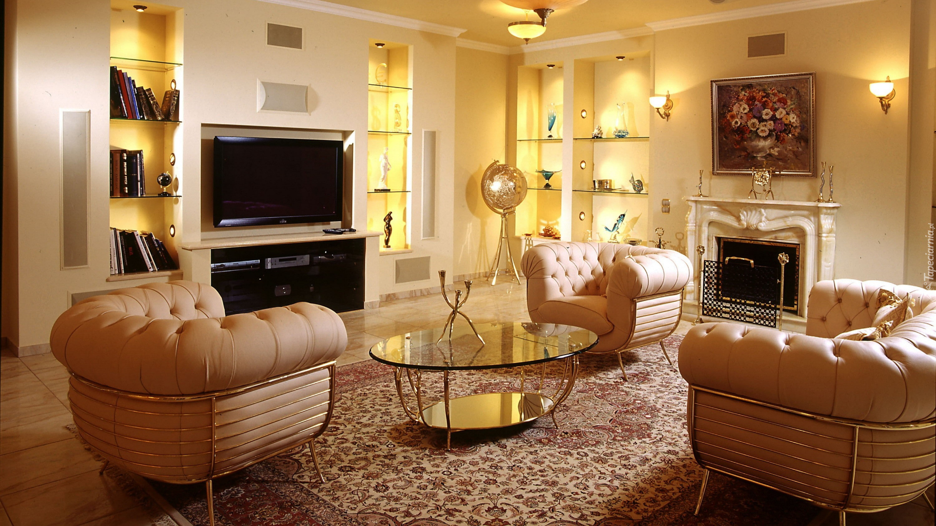 Edytor tapety: Wystrój salonu w beżowej tonacji i podświetlanymi półkami