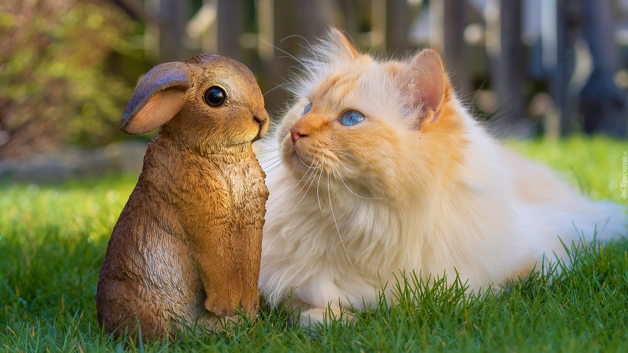 Edytor tapety: Rudawy kot obok figurki zajączka na trawie