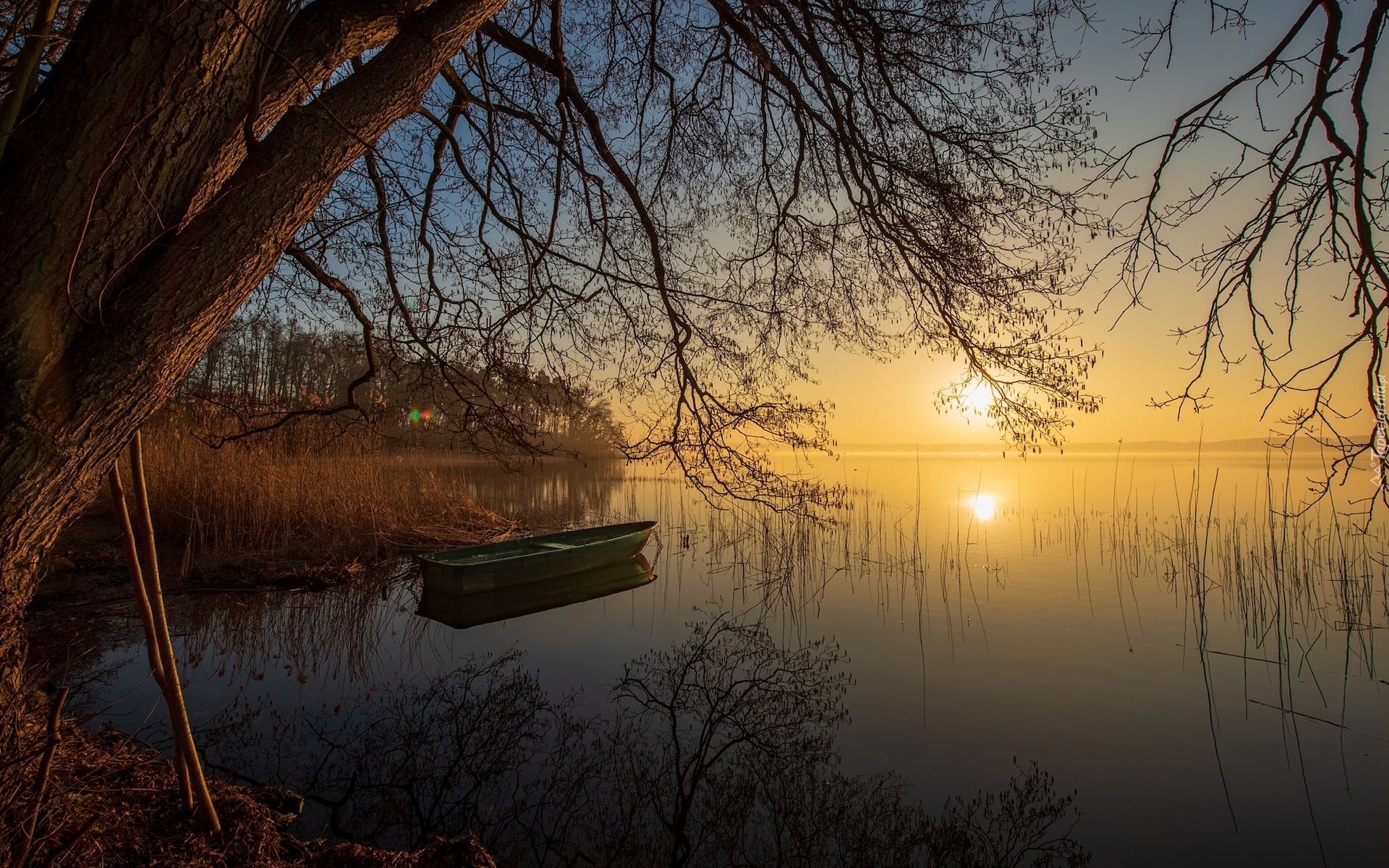 Edytor tapety: Łódka obok szuwar na jeziorze o wschodzie słońca