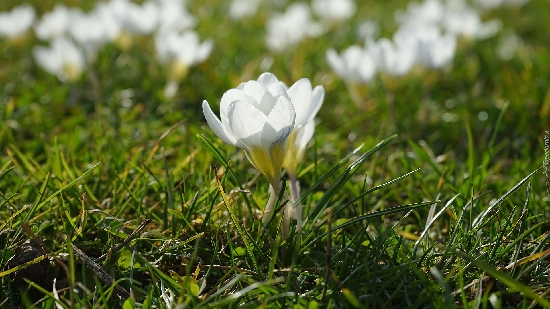 Edytor tapety: Białe rozświetlone krokusy w trawie